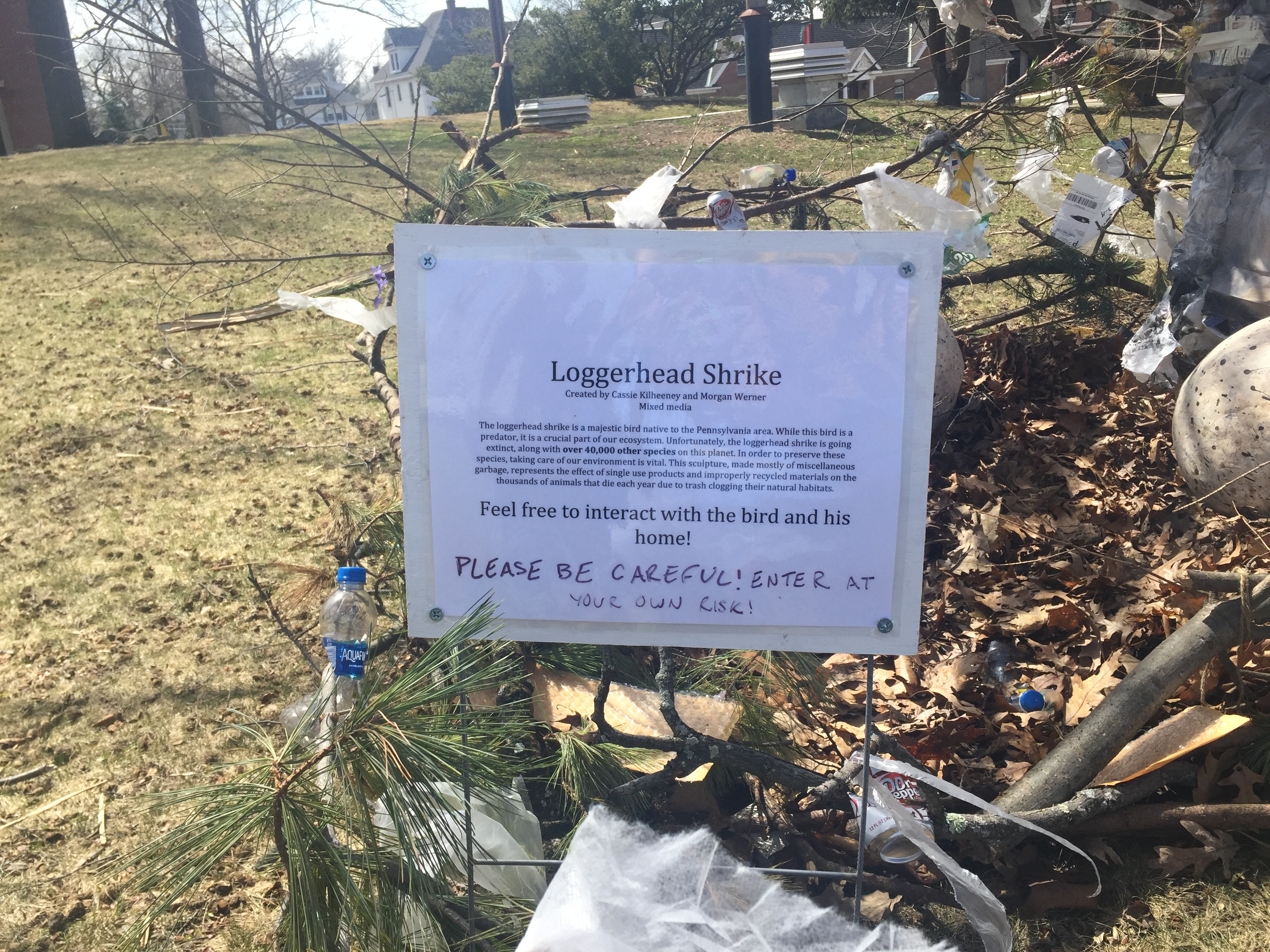 The bird was a sculpture created by Cassie Kilheeney and Morgan Werner. It was a large Loggerhead Shrike, a bird that is native to the Pennsylvania area. However, according to a sign at the site of the sculpture, the Loggerhead Shrike, as well as over 40,000 other species are going extinct.