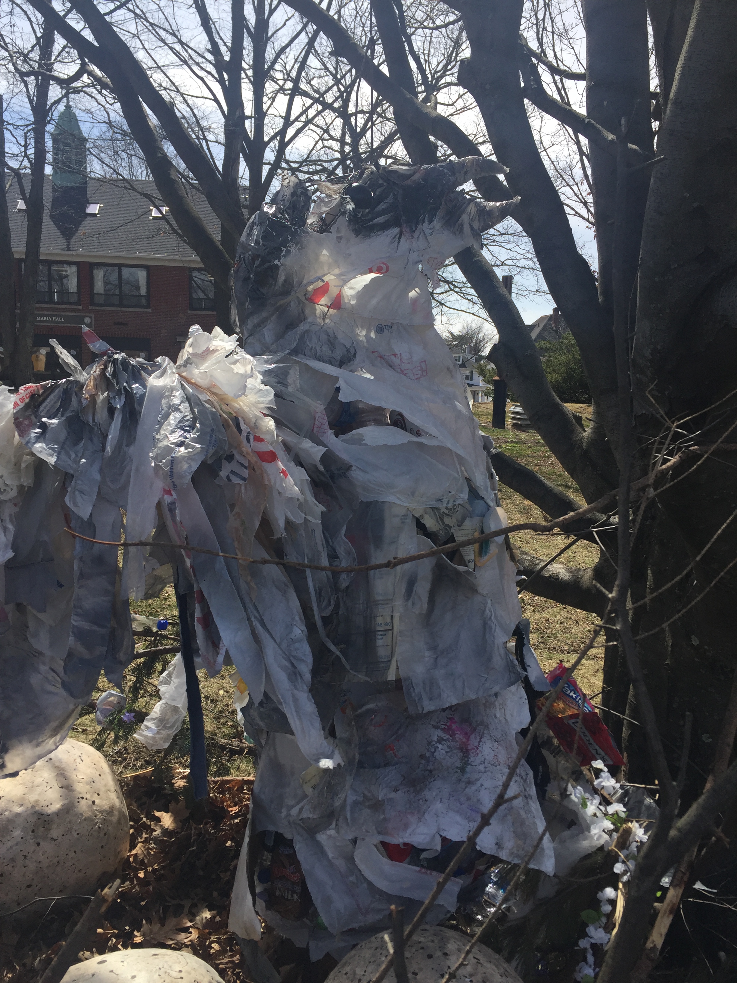 As I was walking to my dorm with my friend and fellow blogger, Carolyn, we stumbled upon a bird. A very large bird, made out of garbage, to be exact.