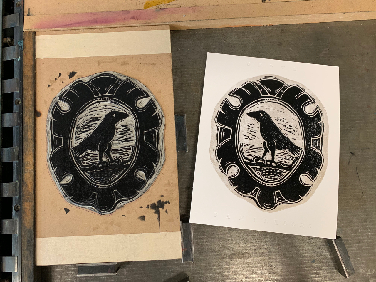 One interesting design on the Duomo floor was a bronze plaque. Of course, I was immediately drawn to this because it was a crow. The marker says SEPVL FAMIL D’OR’S, which appears to be from a Roman family name, Sepullius. SEPVL appears on ancient Roman coins associated with Caesar and other funerary markers, but I haven’t been able to figure out its actual meaning. I decided I want to do a relief print of the design, so I created an edition for the Marywood Print Guild. The print is a two-color linocut with the plaque wording letterpress printed. (You can see the print in person in the Kresge Gallery, located in the lobby of the Insalaco Center for Studio Arts at Marywood University. Opening is Oct. 5, 2019.)
