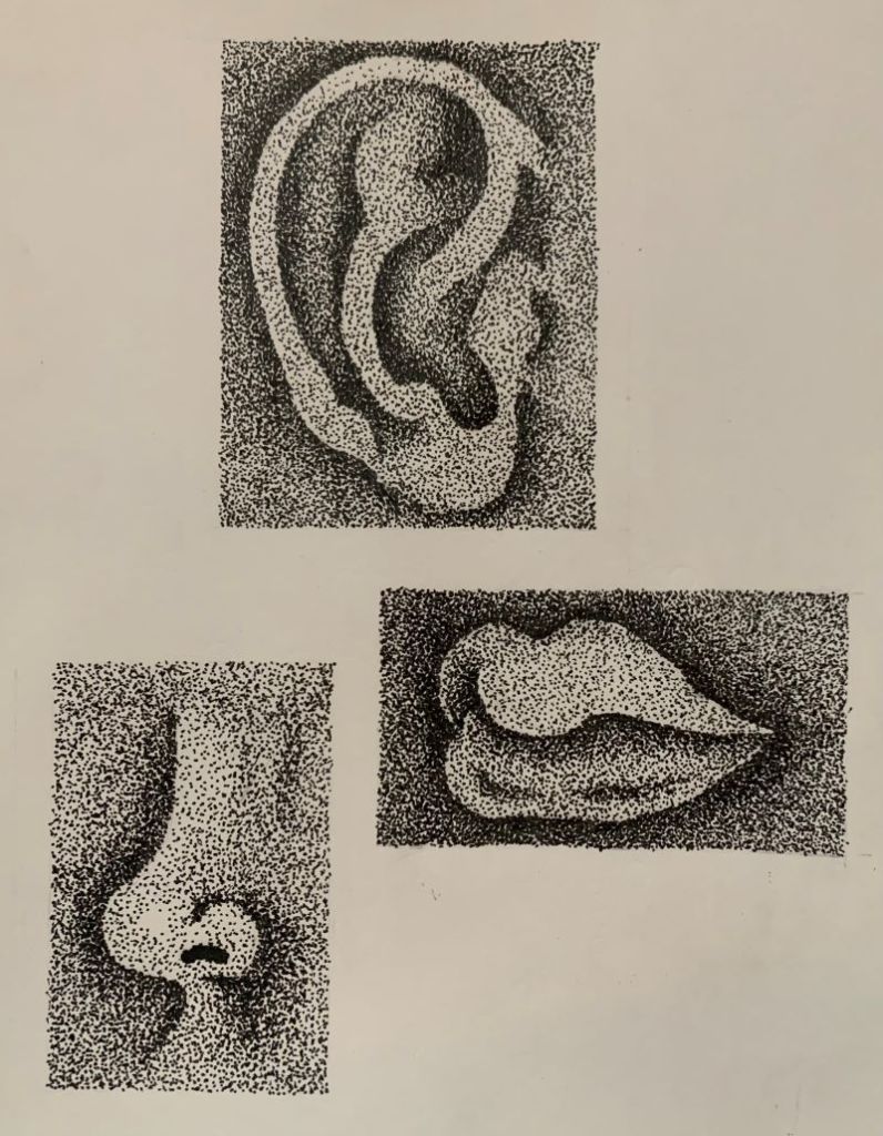 Back when I was a sophomore in high school I was enrolled in a drawing class. In this class we created many different projects of all sorts of techniques. One project in particular was to create a drawing by using the stippling technique with a pen, to which I chose to draw a panda bear. Ever since that drawing class in high school, I have always been interested in exploring the pen as a medium. This week, I perused this interest by using the same technique I did sophomore year, so I started stippling. I chose to stipple small parts of the human body including an ear, lips, and a nose. I chose to draw these figures because another interest of mine is figure drawing and I have always wanted to create more detailed works of the body, so I figured I can combine these two interests by stippling the simpler components.