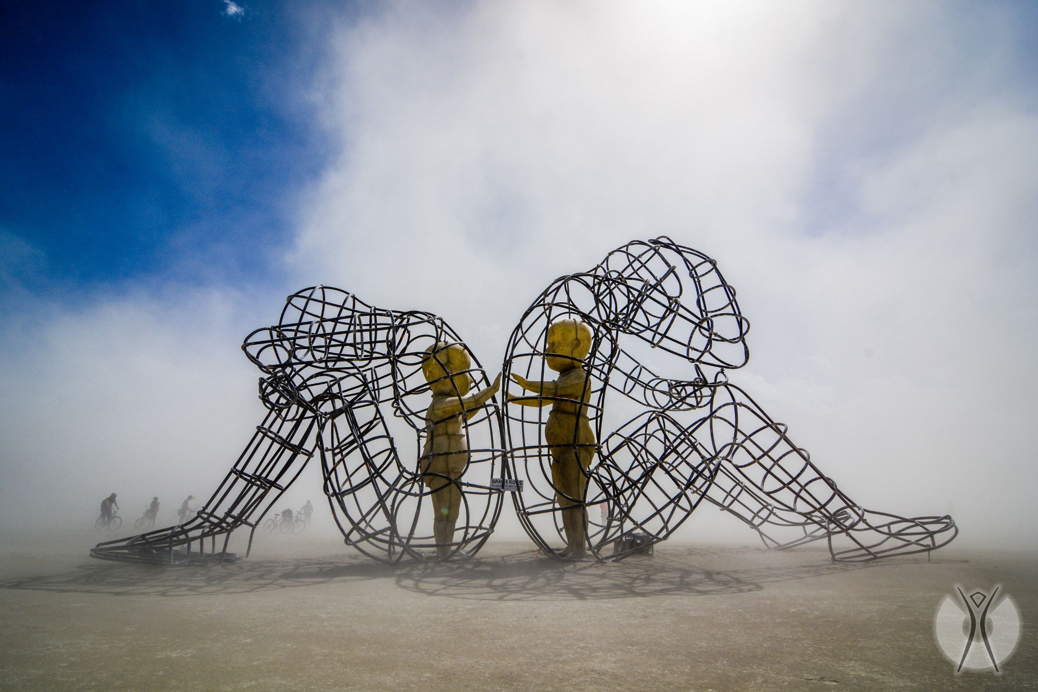 “Love” by Alexander Milov, is a remarkable installation with different interpretations, but each is easy to understand. The large scale of the sculpture aids in spreading its message, drawing massive attention wherever it goes. Even the materials used tells its story so clearly, that our inner feelings are trapped in the cage of our full selves. Excellent work from the artist to convey such a complex idea with such simple execution. Not a single aspect of this sculpture is wasted. (https://burningman.org/culture/history/brc-history/event-archives/2015-event-archive/2015-art-installations/)
