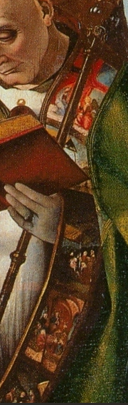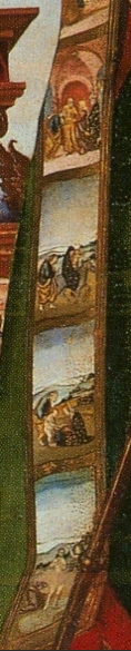 Like St. Lawrence, Bishop Vagnucci also has a cloak that represents paintings, but these paintings appear to revolve more around Mary’s life. Three specific paintings that are easier to distinguish are the Marriage of Mary and Joseph (top left), the Annunciation (top right), and the Flight into Egypt (second panel on right image).
