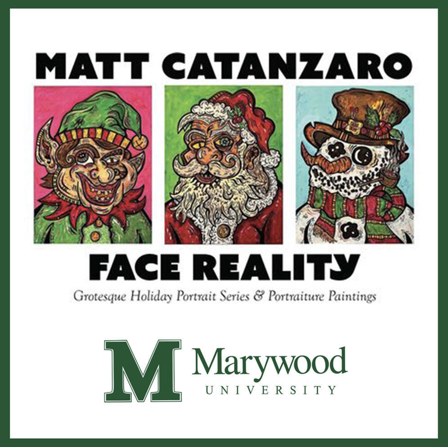 Matt Catanzaro is a Marywood alumni featuring his work in the Suraci Gallery. His work is a cross of surrealism and expressionism. These works are uniquely grotesque with a wonderful understanding of color. Catanzaro parodies his subjects in this collection from holidays.