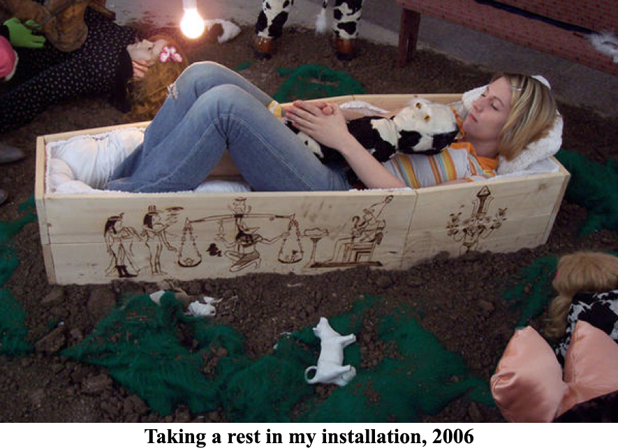 benches, a poor man’s sarcophagus emblazoned with Egyptian images from the Book of the Dead, and it all laid upon a blanket of faux grass and endless pounds of dirt. This was a very personal and autobiographical piece, as most of my work tends to be, inspired partly by the stuffed animal works of Mike Kelley.