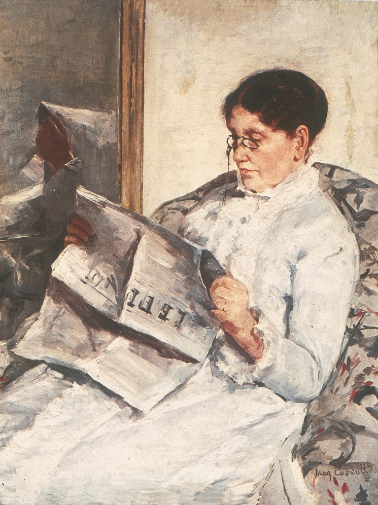 As for women in pursuit of knowledge, Woman with a Sunflower includes a sunflower which for some time was the symbol of the Women’s Suffrage Movement. The whole artwork radiates a golden glow, from her dress to their hair, and it really emphasizes the sunflower. She’s making a straightforward statement about women’s rights and challenges societal norms. Then, in Reading Le Figaro, we have Mary Cassatt’s mother reading a newspaper. Most importantly, not only is she reading, but she’s reading the front page, meaning she’s educated, knowledgeable, and interested in recent news.