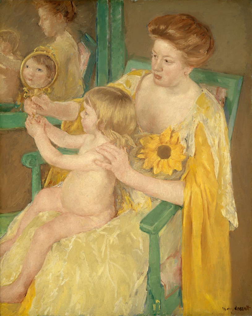 In my paper, I looked at Cassatt rejecting the male gaze through 3 motifs: the choice of motherhood, women ignoring mirrors or reflections, and women in pursuit of knowledge. In The Child’s Bath and Woman with a Sunflower we have scenes of a mother and her child, emphasizing motherhood and it being a choice for women. More specifically, these are intimate little moments that were just quickly captured. It’s not meant to be idealized or perfect and so it shows a more realistic representation of women as mothers. In Reading Le Figaro, we have a different perspective on motherhood. This piece has no children included, only Cassatt’s mother. It stands more as a statement that women do not always have to appear as mothers and can actually participate in other things.