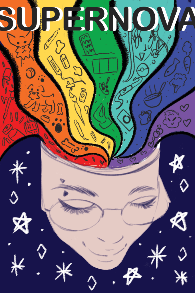 Since the book cover was going to be about me I wanted to include my face in the cover. I had the theme figured out so I added stars around for a celestial feel. I wanted to get personal with this project and give as much information in one image as possible. I wanted to have an explosion included in the image to depict an overflow of ideas. I combined my face with a rainbow explosion that in each color of the rainbow had elements that reflect my life and who I am. The book cover was digitally made in Photoshop. I named the book Supernova as it means to burst and expand with light and energy which I want my career and life to be like that.