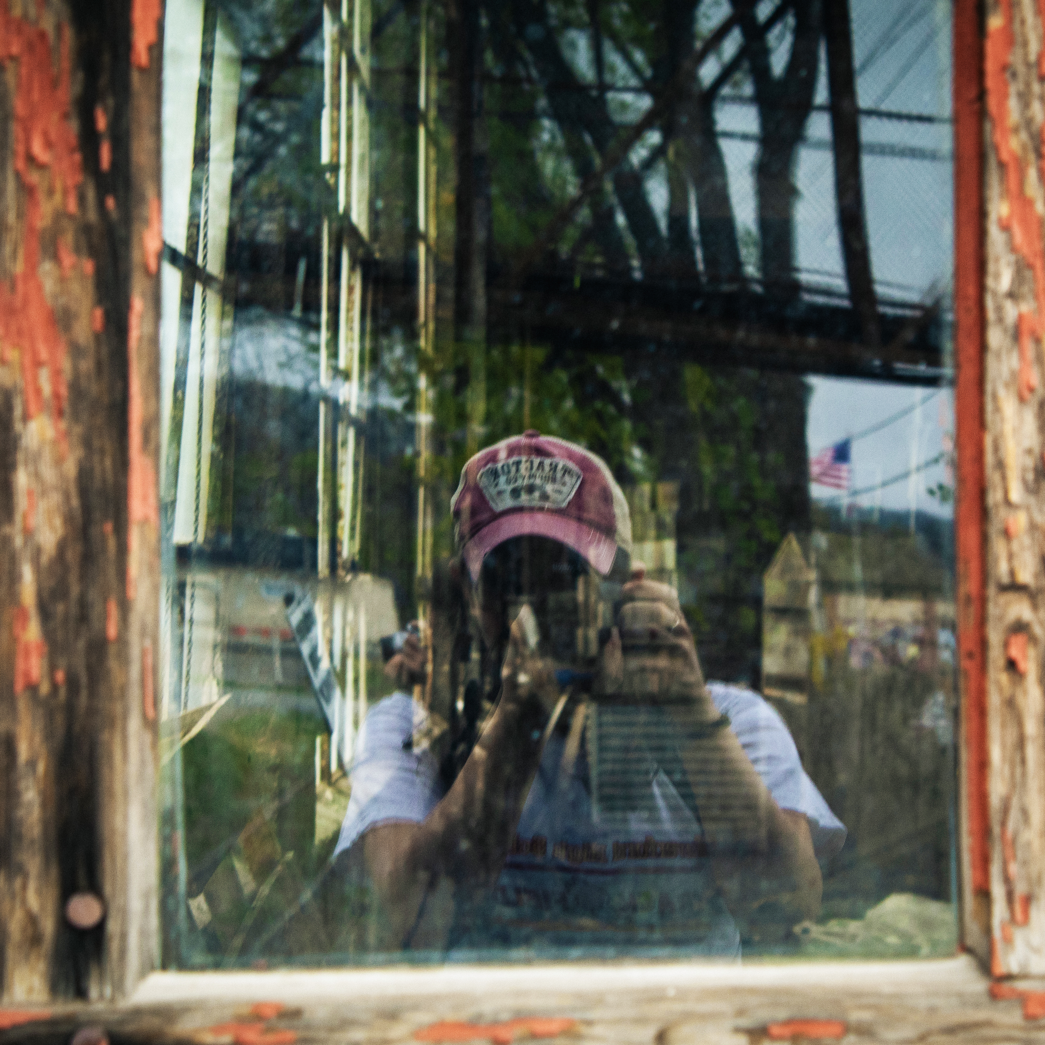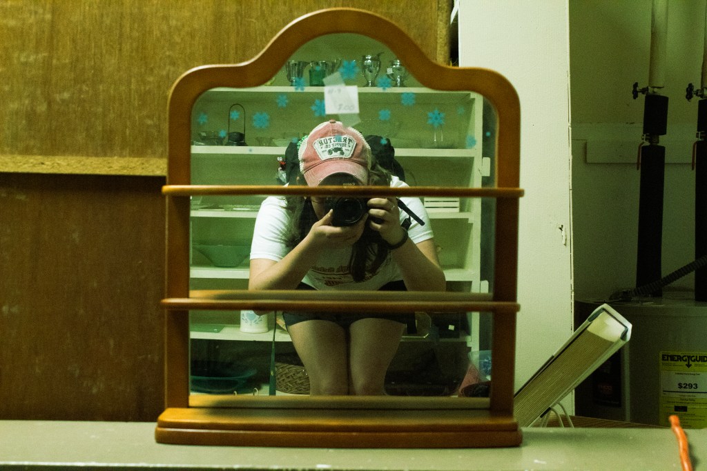 These mirror self portraits were taken while exploring Honesdale in the spring of last year. As part of Photography as a Means of Self Expression (Art 319 with Professor Sue Jenkins) part of our class explored Honesdale through photographs. I took the opportunity to continue this specific body of work as well as explore other things like my mini series on light fixtures, and some fun architectural work with all of the intriguing buildings in Honesdale. I wanted each photo to tell a different story about my surroundings and let the viewer draw their own conclusions about me.