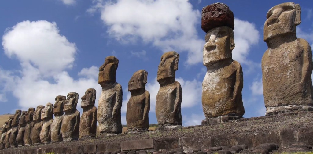 My mother was born in Chile, and she still has a lot of patriotism for her country so whenever she would tell me stories of her time in Chile she would include the Easter Island. I personally have not had the pleasure to visit her native country, but it is definitely on my list of the places I want to visit. Easter island was a place I knew as a child. It was like a fantasy tale told to me by my mother and she told it so well that I yearned to see it. So when I was able to online search images of the statues it was star striking. I will begin by saying that the Mo’ai stood the test of time it is incredible that they are still around today thanks to the help of Chilean historians. The statues are carved so minimally but the visual communication is instantly understood. I believe the Mo’ai are representations of men, or even gods. Their heads are much large than their bodies and that is if they have bodies. Some are adorn with caps or hats on their heads and some continue into the ground as revealed from historians on expeditions to find out more about them. On their back there are even more details, glyphs, and perhaps stories from the past.