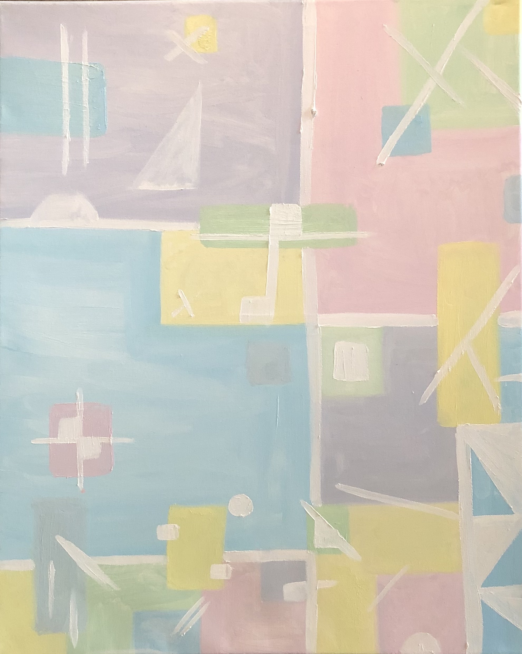 This is a color field project I did in Painting 2. We had to pick a color scheme and make an abstract painting out of it. I went with a pastel color scheme because I love pastel colors, I picked pastel blue, green, purple, pink and yellow. I added some white lines with some small shapes to add a little something more to the painting because it was a little too plain with just the colored squares. I enjoyed doing this painting because I didn’t have to think very much and I could just be free to do what I wanted.