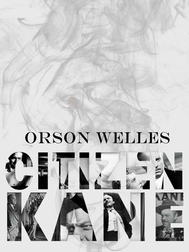 One of the big shots in the movie is when there is a huge banner that has KANE written on it with this huge blown up face under it. I liked the boldness of that typeface. Because of that I went with a san-serif bold face. Blocking out the title to fit horizontally. Then contrasting that thick text with the author’s name in a slim serif typeface.