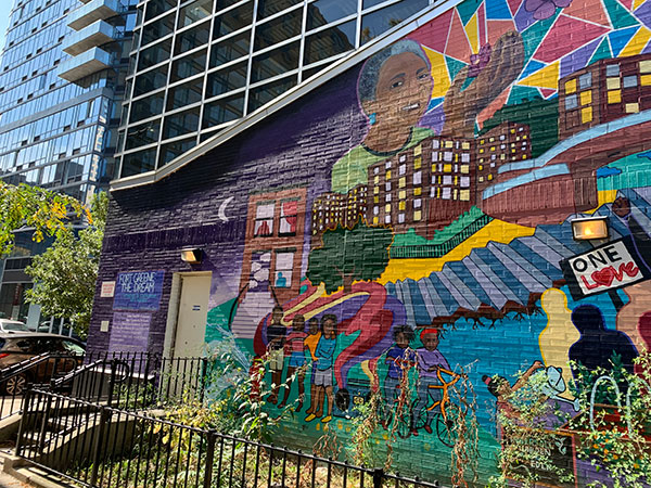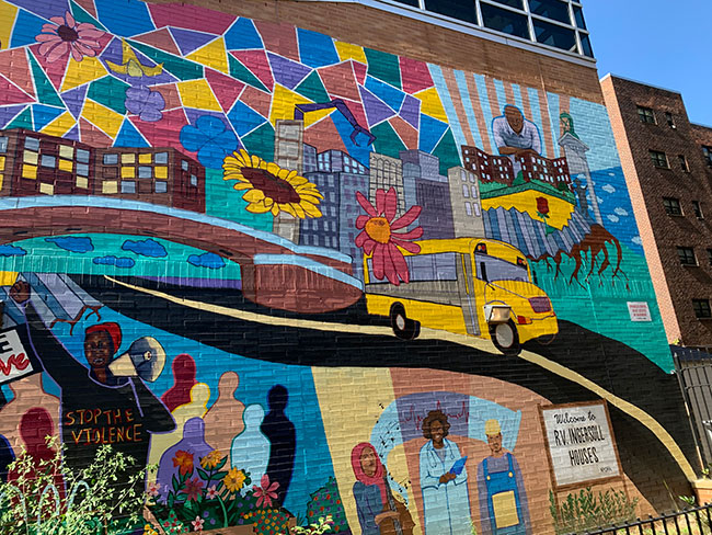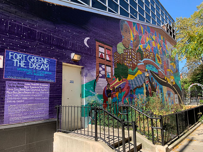The Ingersoll Cornerstone Community Center mural, by Groundswell Mural Project, is a mural in the Forte Green/Downtown Brooklyn neighborhood. These neighborhoods carry a rich and diverse history, and through this community garden mural, artists were able to depict this history to those in the community. The bright colors and bold design beautify the neighborhood while the collective history draws the community closer.