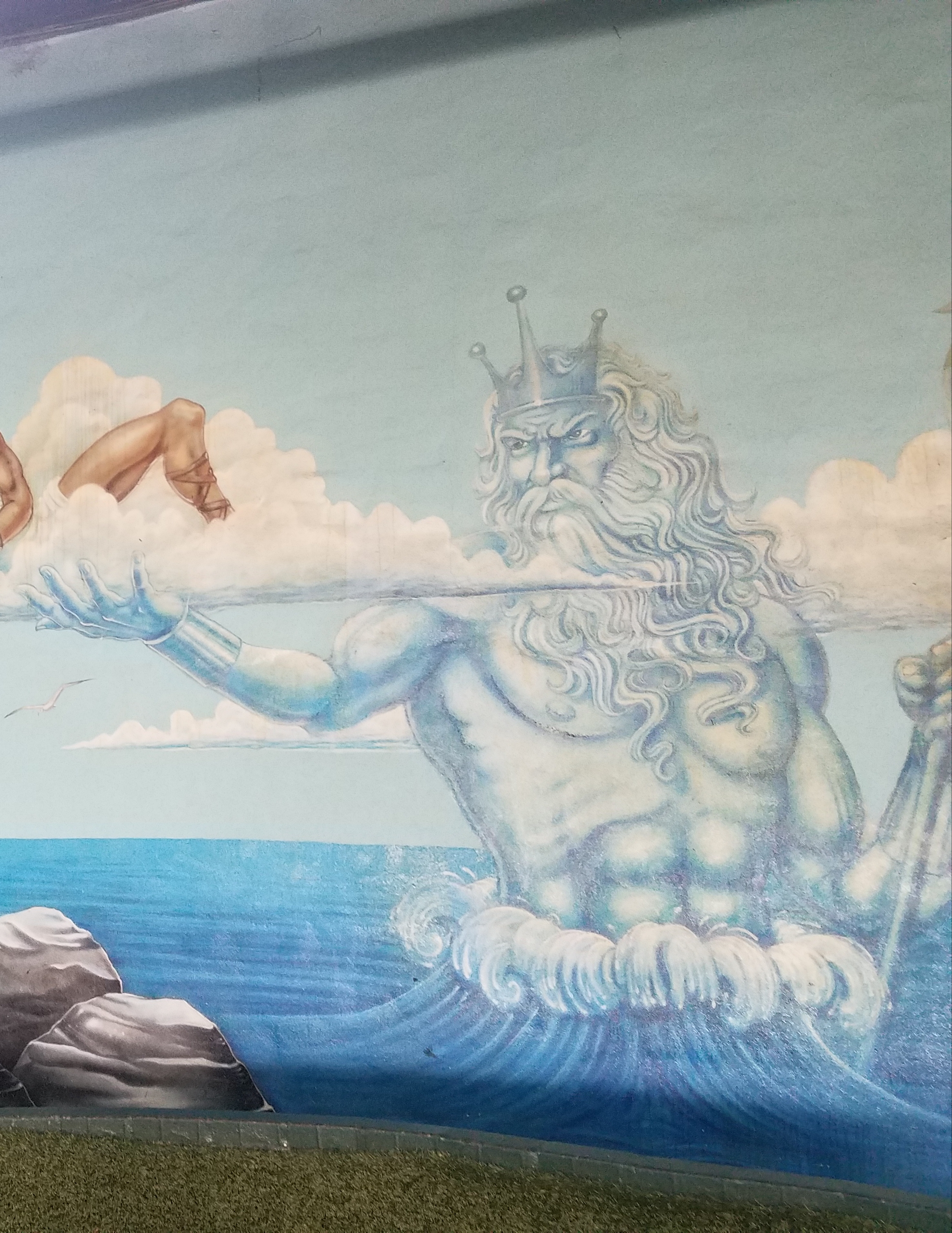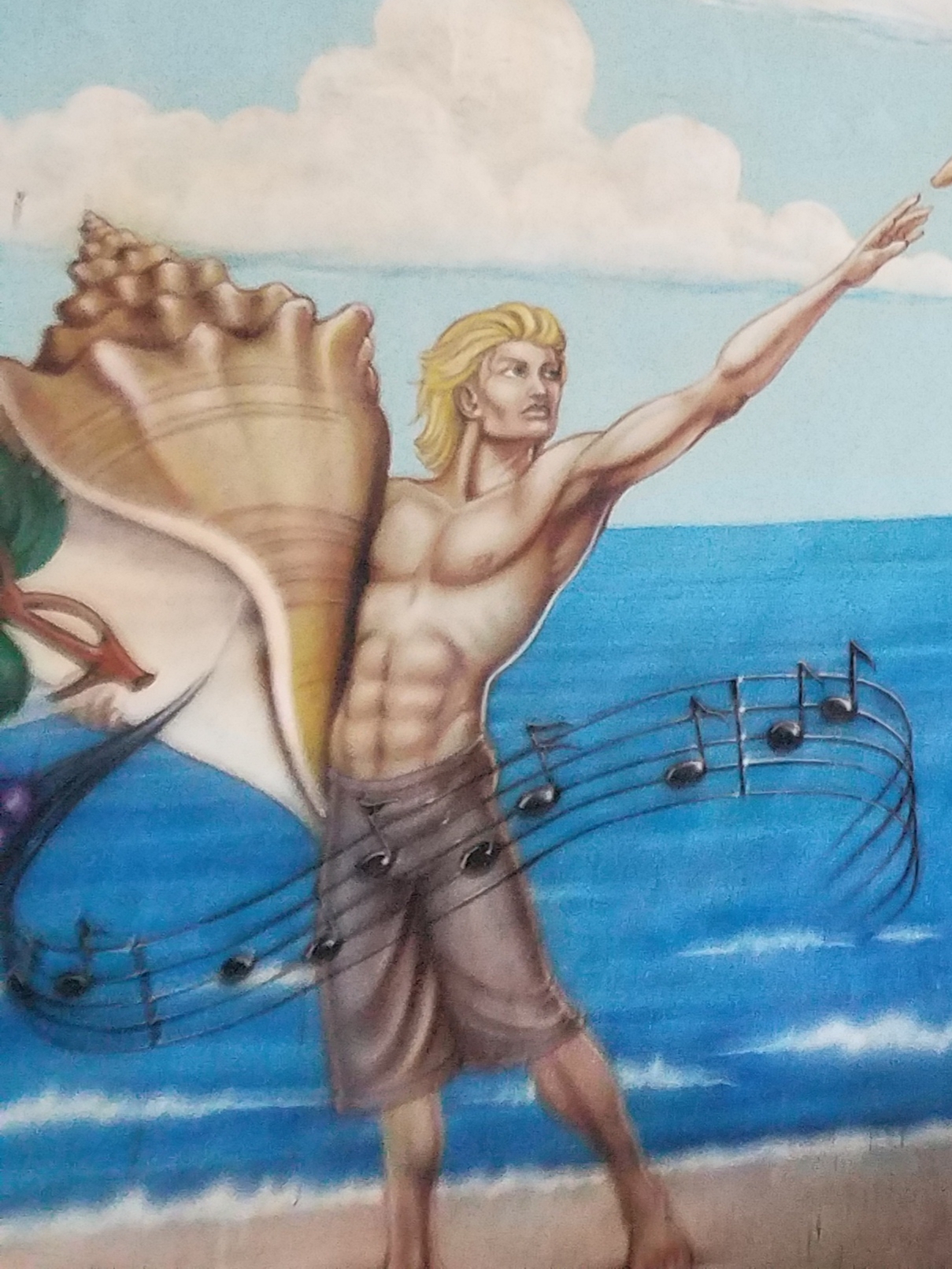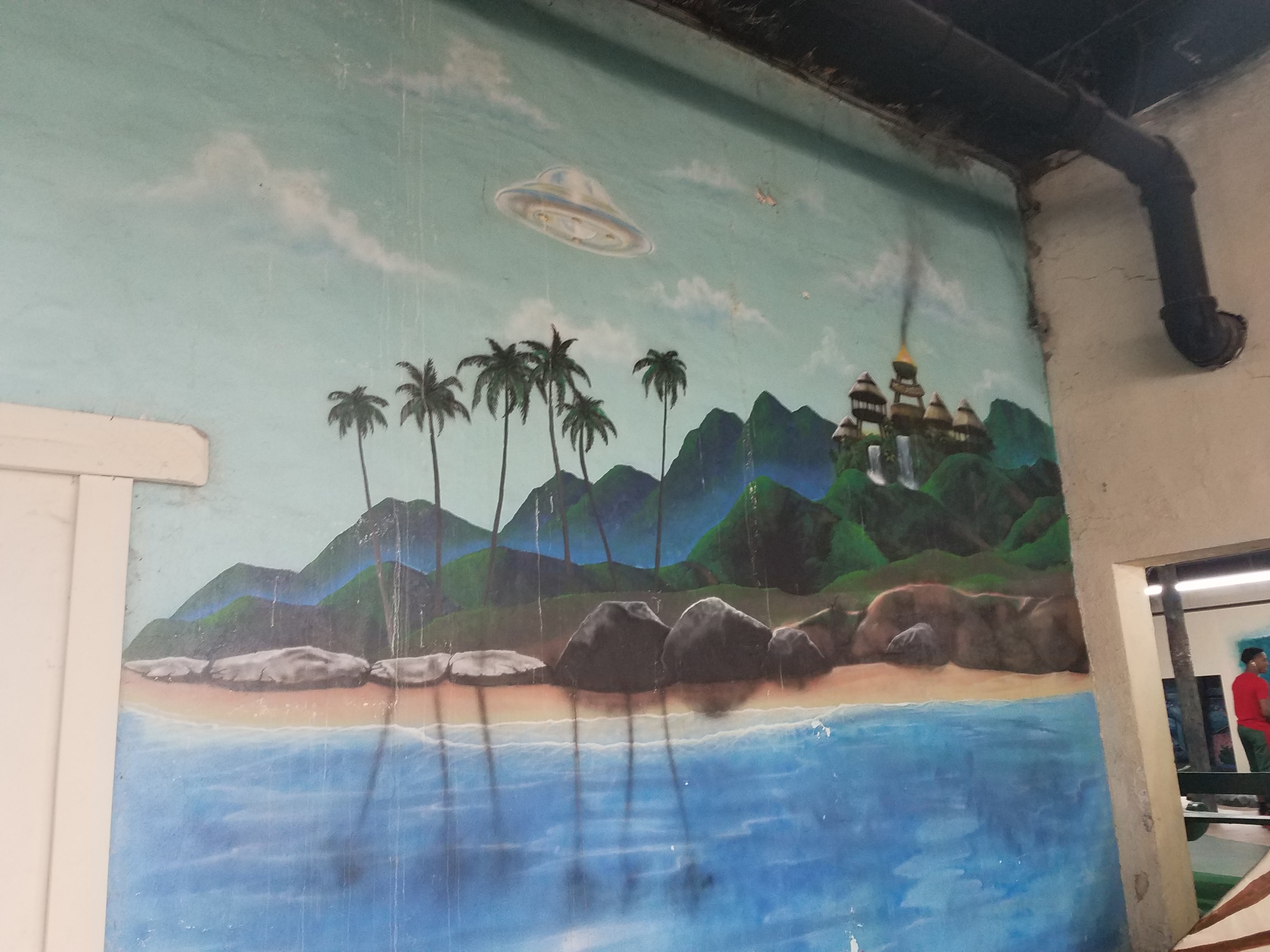 I never seen art like this at a mini golf place so I was quite surprised. It looks to fun and looking at every figure individually just makes this mural so much more interesting. I wonder what went through the artist head while painting this. The middle guy with the sun glasses is just so funny to look at and then on the other side there is some alien stuff happened. Its so random and made us laugh.