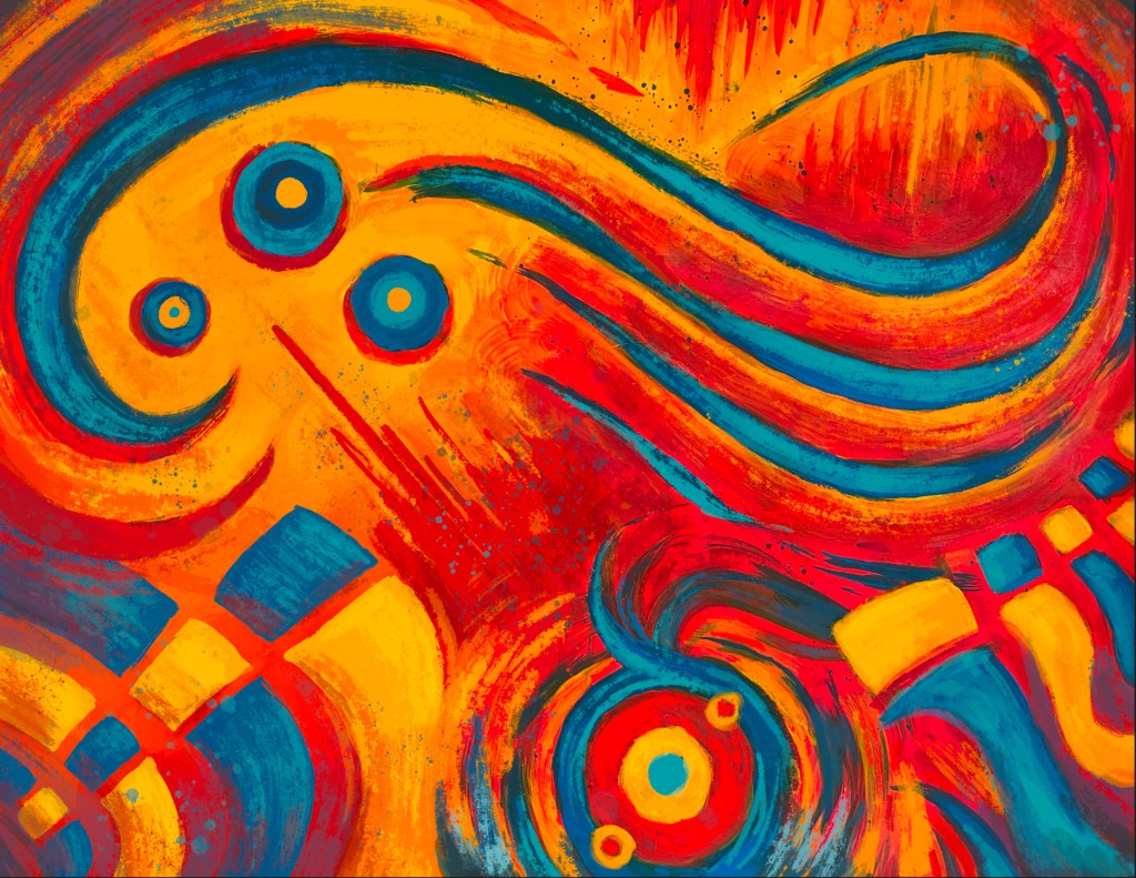Bad Dog No Biscuit is full of high energy to the point of alarm. With its bright blaring brass, it has an immediate impact on the viewer and thus I used a warm and highly saturated color palette to reflect this. The beat and melody are asymmetrical and unpredictable. The whirring radio noises in the background made me opt to create these highly textured vertical lines, the one most readily seen being the blue one in the lower left corner. Ripping in the timbre creates this nice auditory texture that I replicated visually with rough, open brushwork. The paint splatters are used for the high-hat. The bari saxophone playing in the background, as well as the beating bongos provide the rhythm, replicated via the concentric circles as well as the repeated squares in blue and yellow coming in from the right of the picture plane. The instruments running up and down the scales and the dramatic blaring outro is represented in the swirling blue lines in the upper half of the piece. Their chaotic nature is balanced via the cool blue and red and yellow creating a yin-yang effect over the background. This visually depicts the rationale beneath the improvisation. Jazz is organized chaos and this is what that looks like to me.