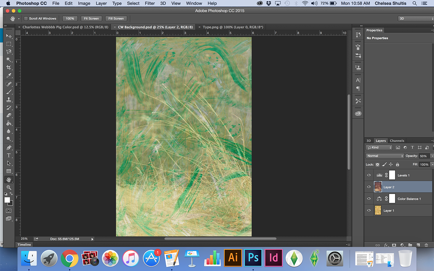 To color in the pigs I took a traditional approach with painting. I took acrylic paint and mixed different reds and pinks. Then I dabbed and swiped the different colors onto paper to create a different texture. I used the same approach to create possible backgrounds as well. Once I was done creating different textures I scanned those into the computer and cleaned them up in Photoshop as well. The next step I took was to combine my line work and paintings together in Photoshop. I did this by deleting all the white space from my line work. Then I placed the textured painting behind my line work to look like the pigs were colored in. Then I had to do a lot of erasing so only the pigs were filled in with the bright pink color. After a lot of playing around in Photoshop it was time to work on the background. For this I combined photography with another textured painting I created. In Photoshop I placed the painting on the bottom most layer and then I placed the photograph on top. The photograph I chose was of a hay pile and a grassy area. To get a collage-like effect I changed the opacity of the photograph to get the paint strokes from the background layer to show through. I also adjusted the levels and the color balance until I was happy with the overall background image.