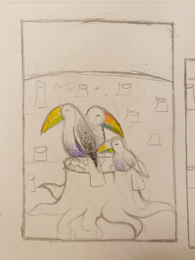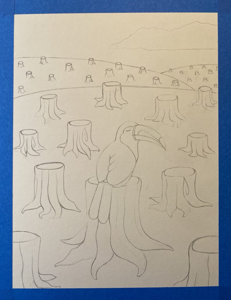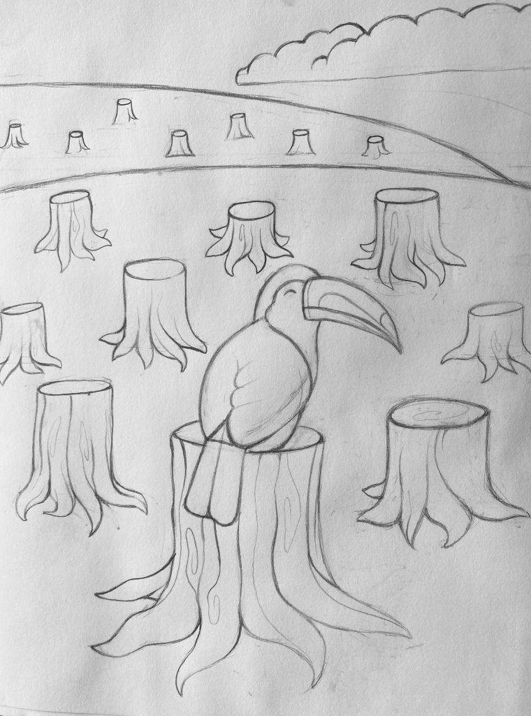 I wanted to emphasize the damage that humans are doing to the rainforests, and specifically chose the toucan because as a well known tropical bird it could be used to represent that the area was once a rainforest habitat. I ended up using the first sketch because I felt that it was the one that most simply portrayed my idea. My professor and fellow classmates also helped me choose this one as well. Their input was very helpful the whole week!