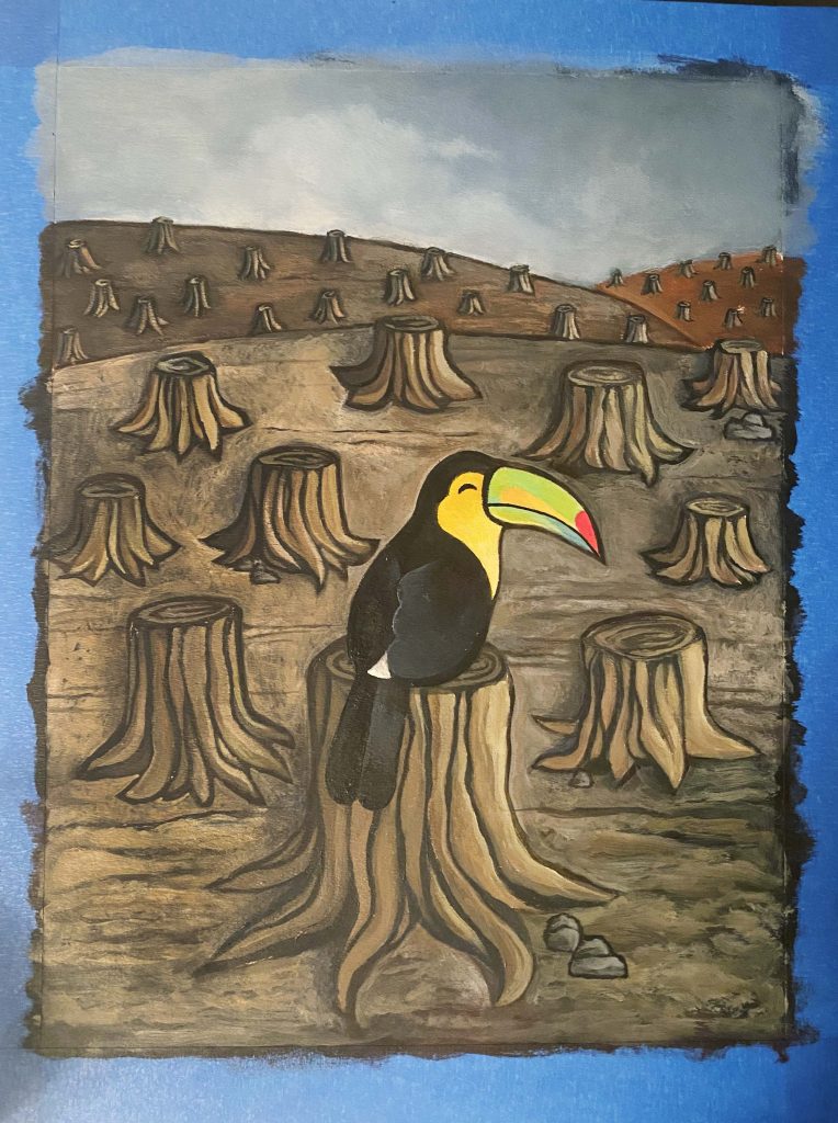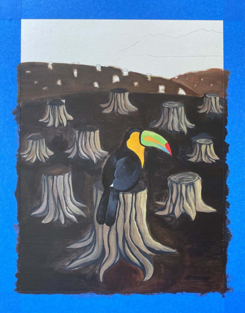 When I paint I prefer oil paint over acrylic, but for this project we only used acrylic. I hadn’t used acrylic for a while, so I had adjust to a less familiar medium. When I paint I begin painting darker colors as a base for my lighter colors. I used the same technique for the stumps that I did for the ground. You can see this dark under layer in the first picture. I really liked how the toucan worked in this image, being the most colorful part of it really helped him stand out.