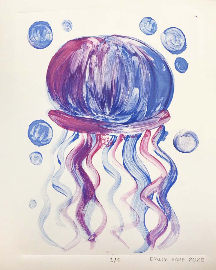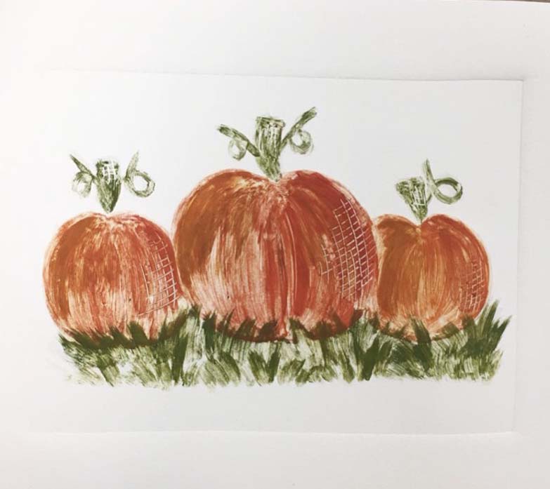We used a type of printing called “relief printing” which is a process where the paper used for the print is soaked in water, dried off, and then run through the press with our plastic plate. This creates the indent shown in the prints below. I was amazed to see how well what we painted on the plastic transferred to our paper to create a finished print. There are so many possibilities when it comes to making prints with this method.