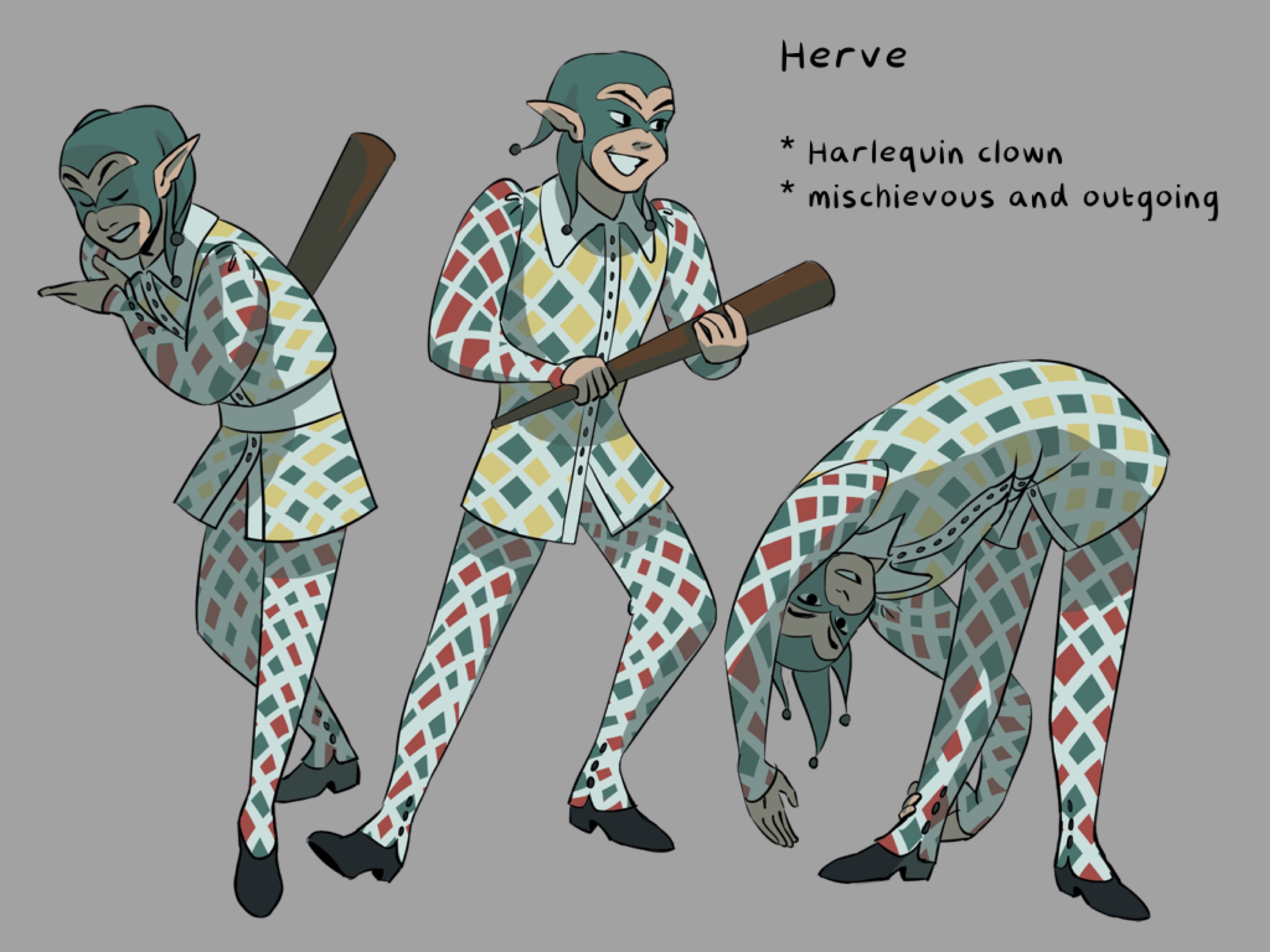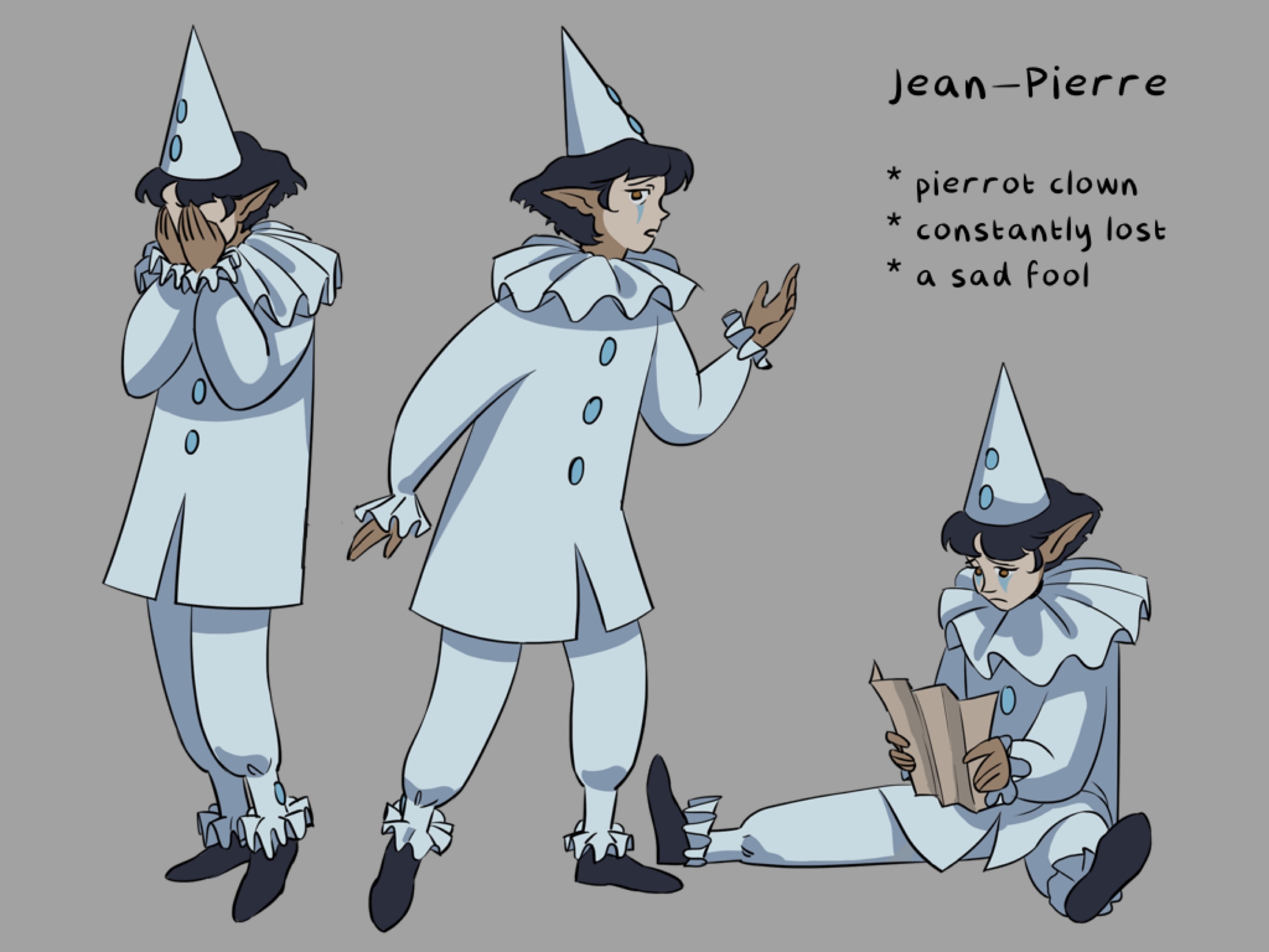 We first designed characters, which I am always excited about. My protagonist is a level-headed commoner who adapts to the situation pretty well. I made three side characters who the protagonist meets at intervals throughout the game (the story is meant to take the form of a game), and the antagonist. I did not have to design five characters, but I usually take on more than I can handle, so of course I did.