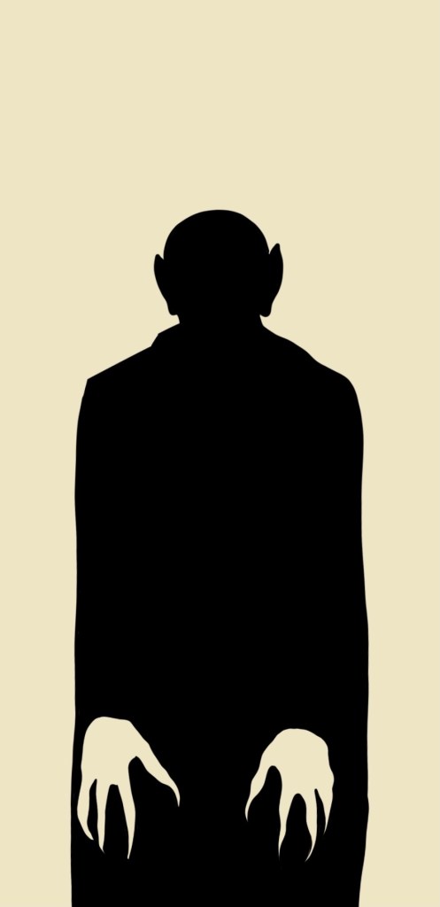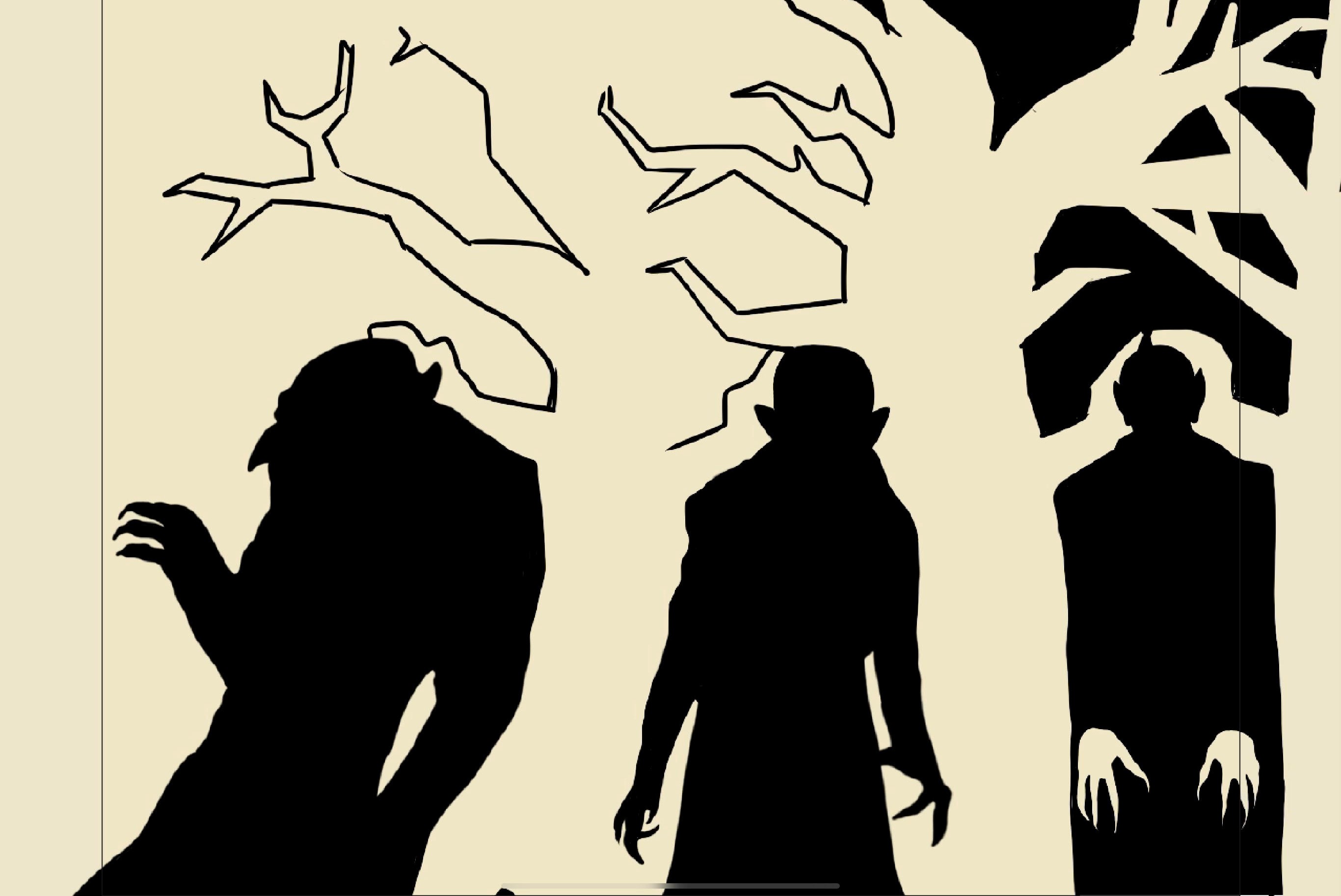 At this point I was pretty confident at how the image would take shape. I wanted to add other figures to the black part of the image, for instance, by possibly making bats out of the branch shapes in the upper part of the drawing. I just ran out of time! Eventually I would work more tree branches in between the shapes of the figures and use photoshop to warp certain parts of the image so it would appear more upright and less right-ward slanting. I also removed the white hands of the right vampire as it didn’t exactly fit the assignment (although I thought it was cool). The final result is below! For anyone interested as well, I made a phone wallpaper for myself out of the rightmost nosferatu, I will include it as an image below for anyone else that wants it!