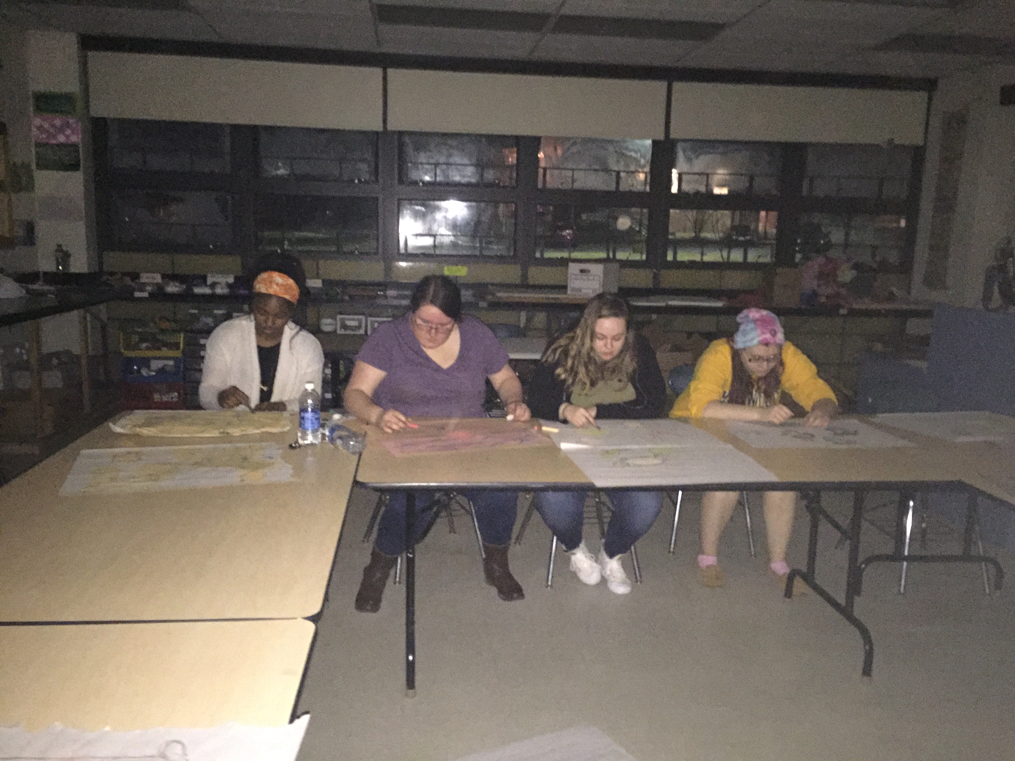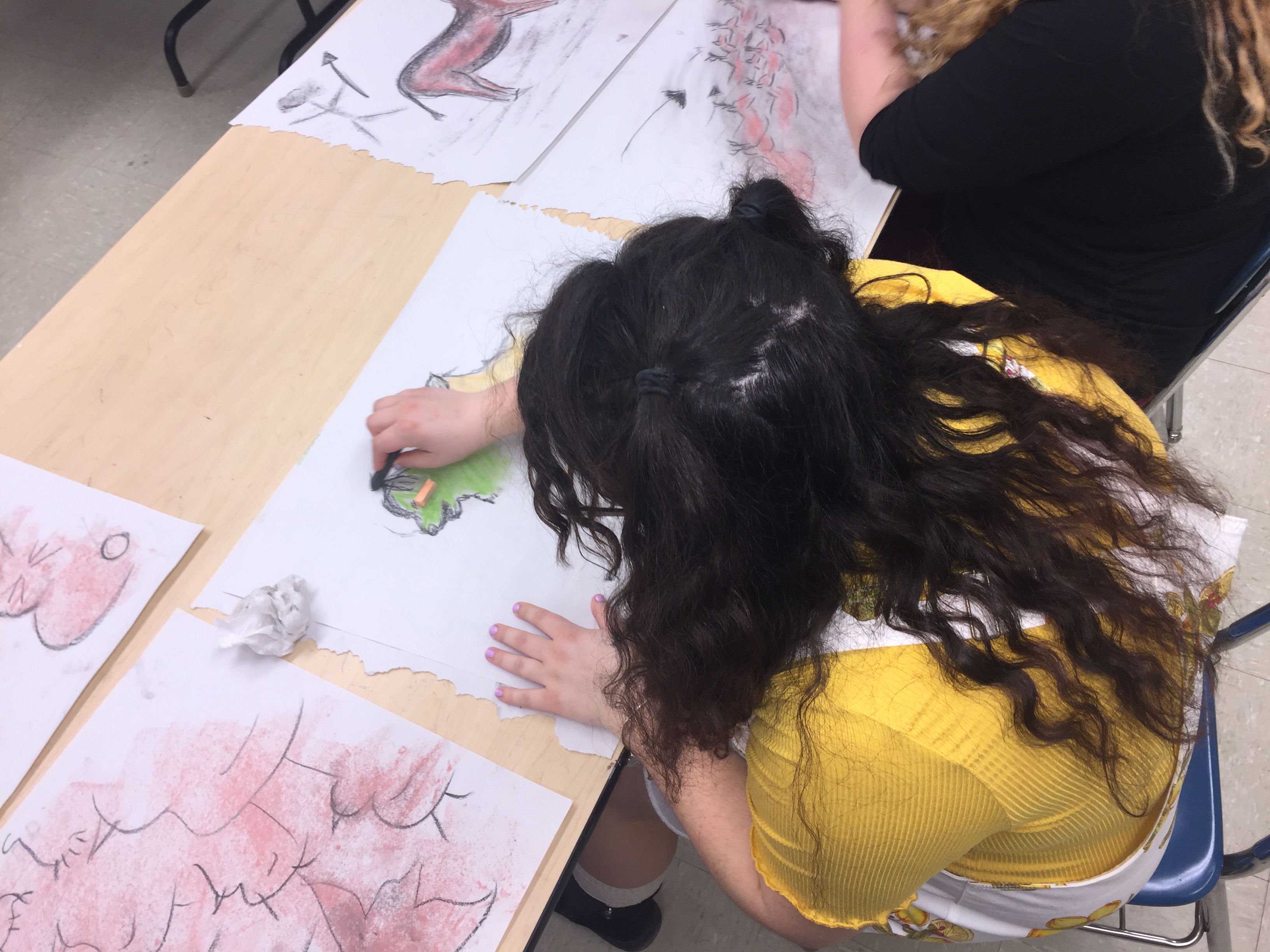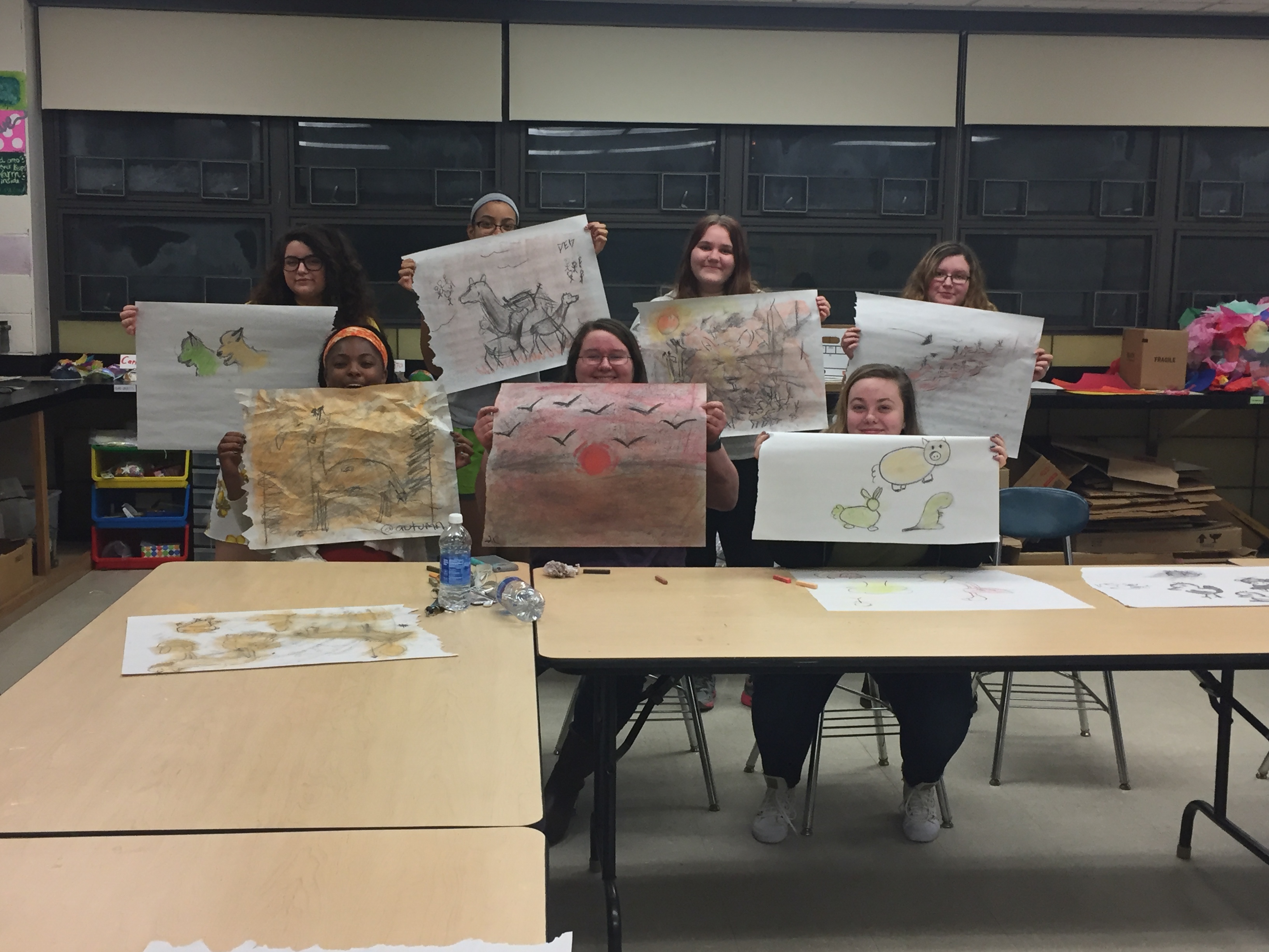 We were each given a piece of newsprint, a piece of charcoal, and a colorful pastel, and then the lights were turned off to represent the darkness of a cave. We then worked for a little bit on our masterpieces.