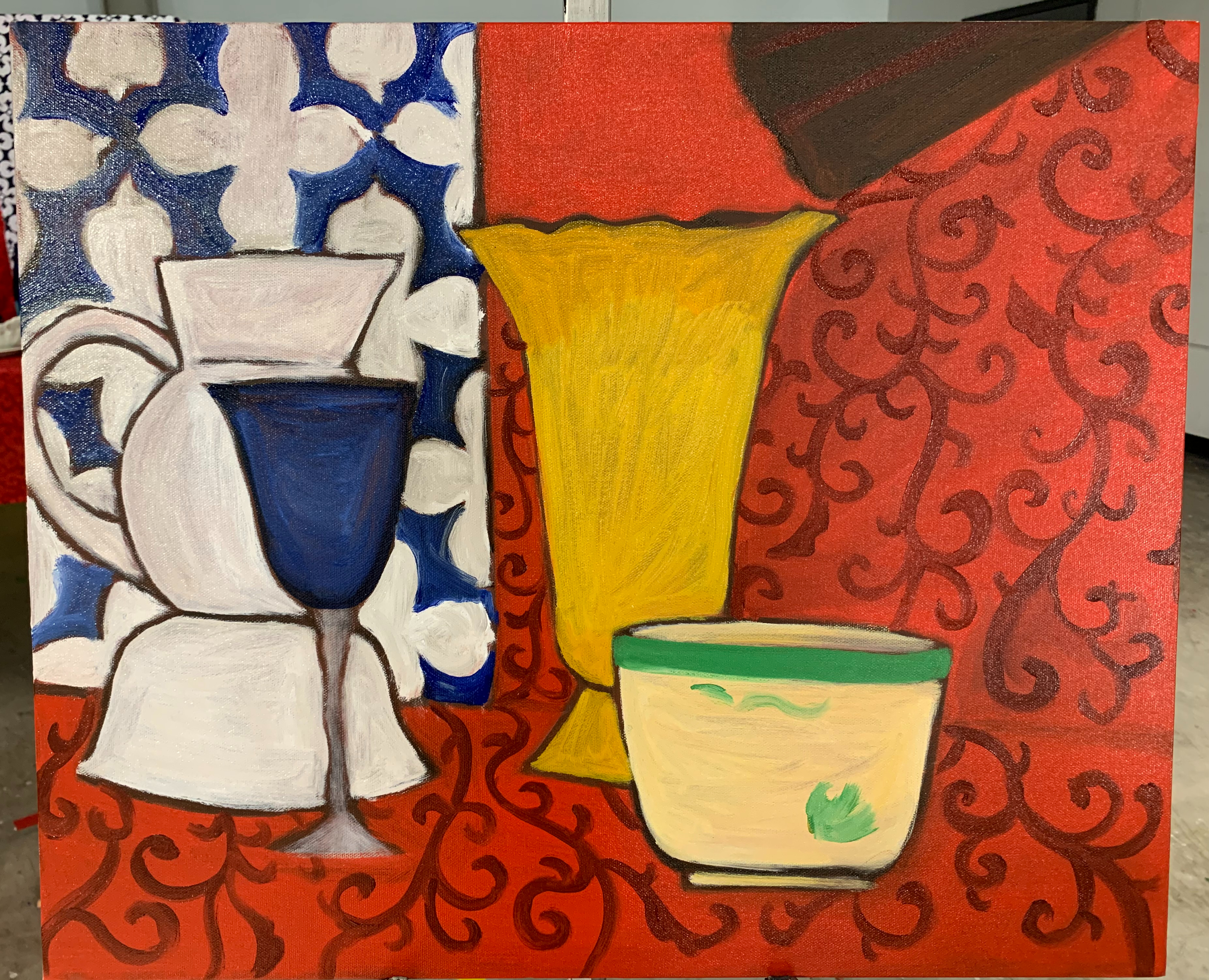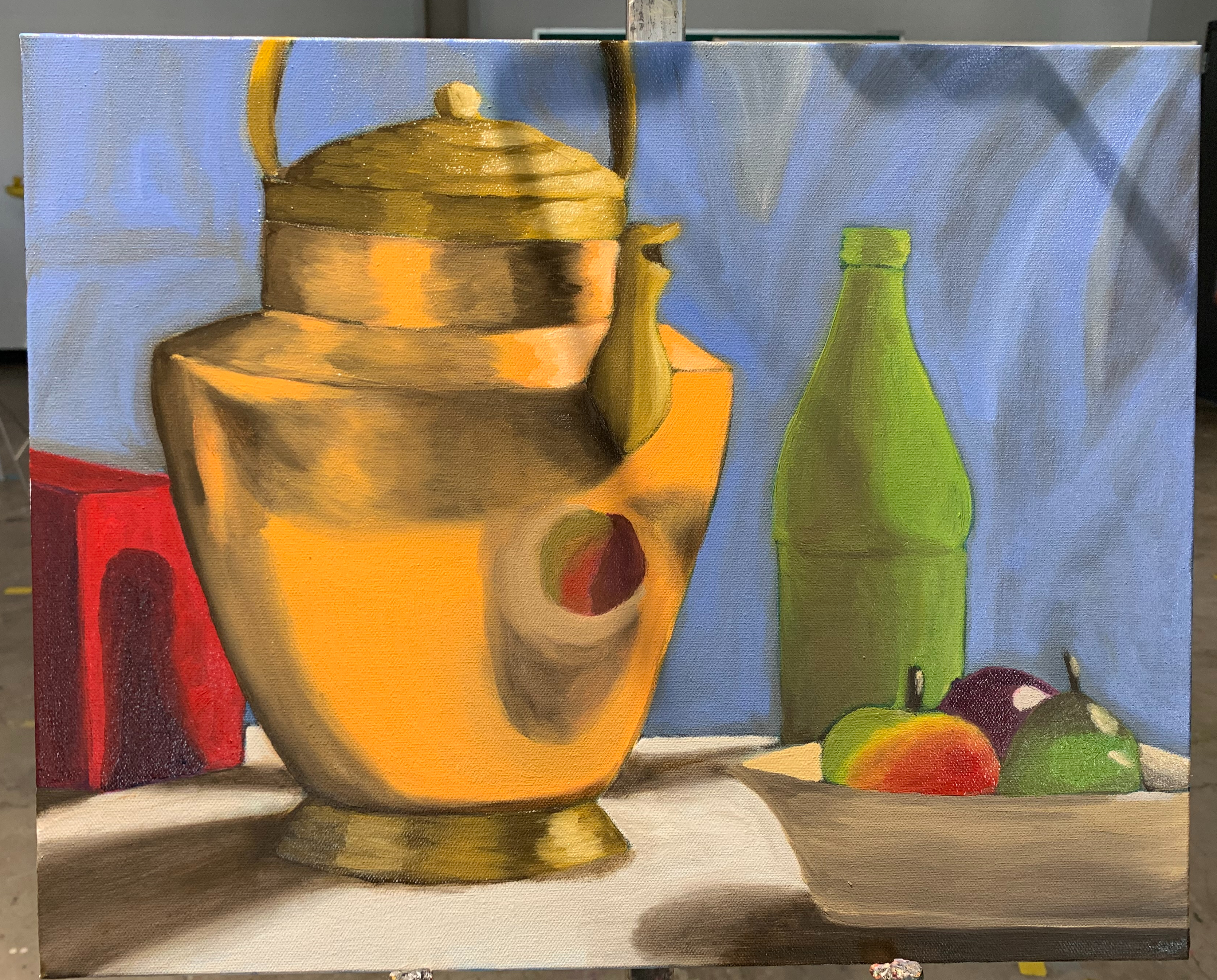 I’ve been growing more comfortable with using oil painting, although attending a 3 hour painting class twice a week definitely helped. We started a still life a few weeks ago using a full-color palette compared to the limited 3 color palette used previously, which gave me creative liberty to mix and blend a variety of paints to get a certain color I wanted. Below on the left is the complete still, and on the right is one we began recently, playing around with shapes and patterns.