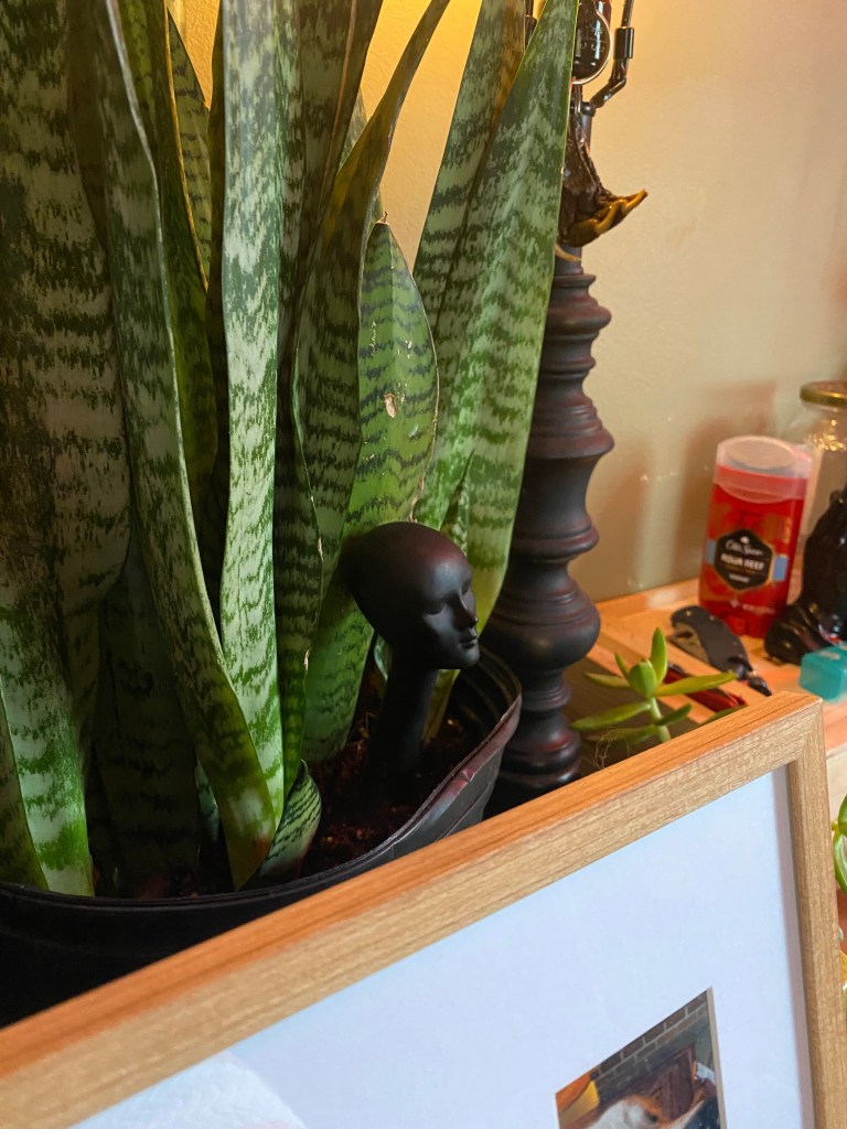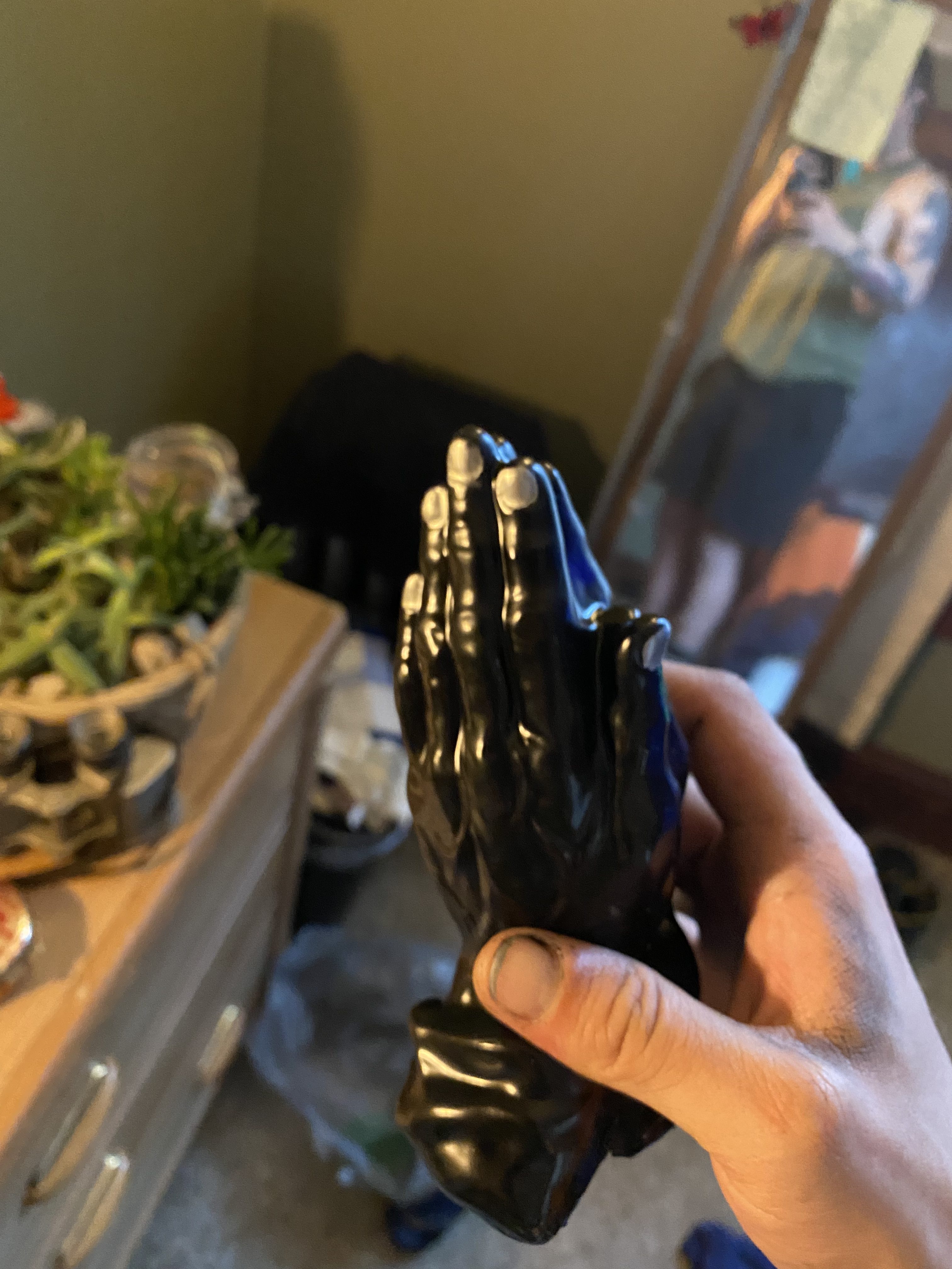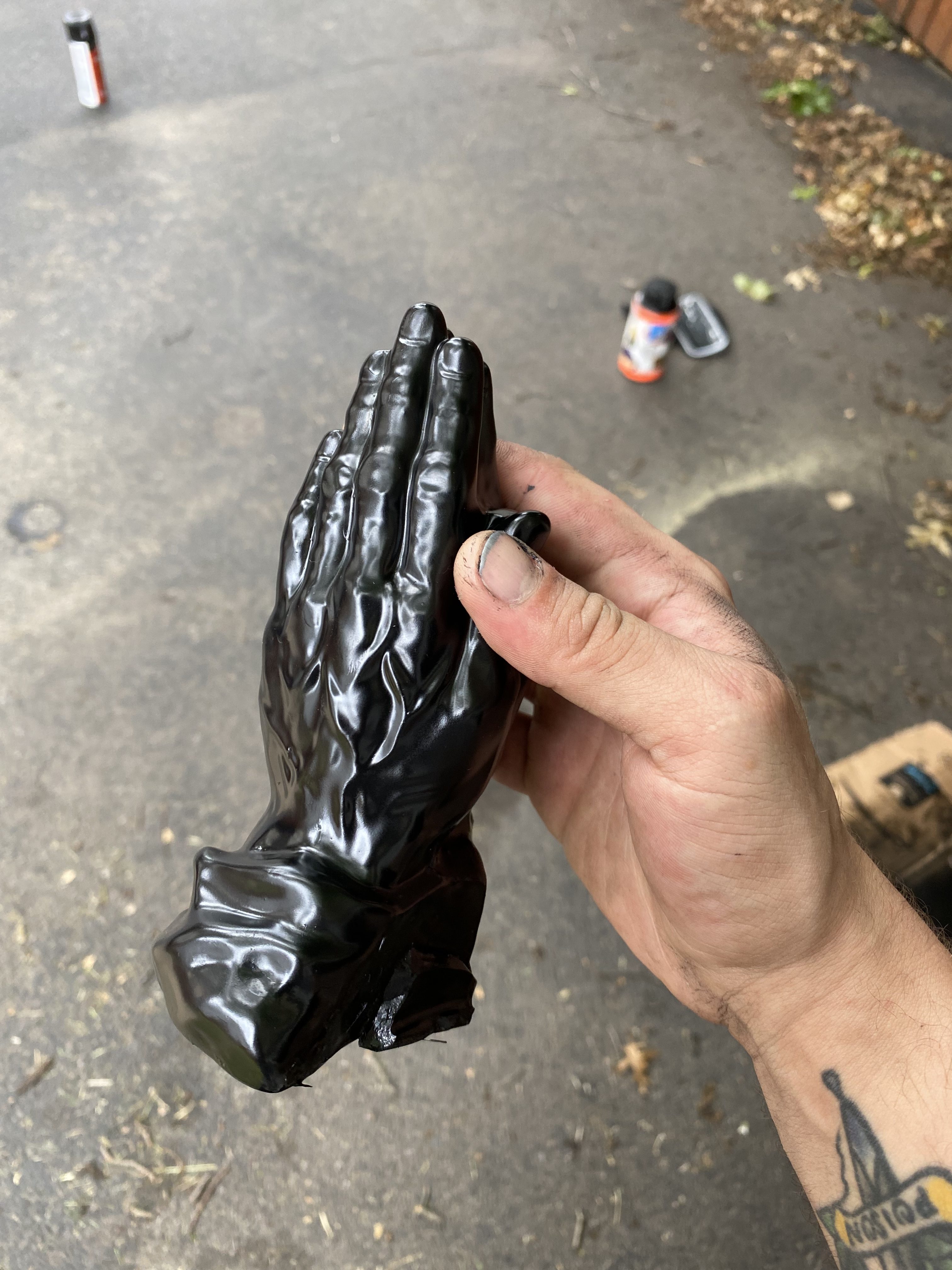 While these objects were great, the question of what to do with them remained. Maybe it’s best to show instead of tell, but as far as the hands go, I spray painted them black, which gave them this graphite-looking texture. I also painted the nails silver, although I probably won’t keep that. Spray painting stuff from Goodwill has become a weird hobby of mine I guess… this is like the 5th or 6th time I’ve found myself doing it.