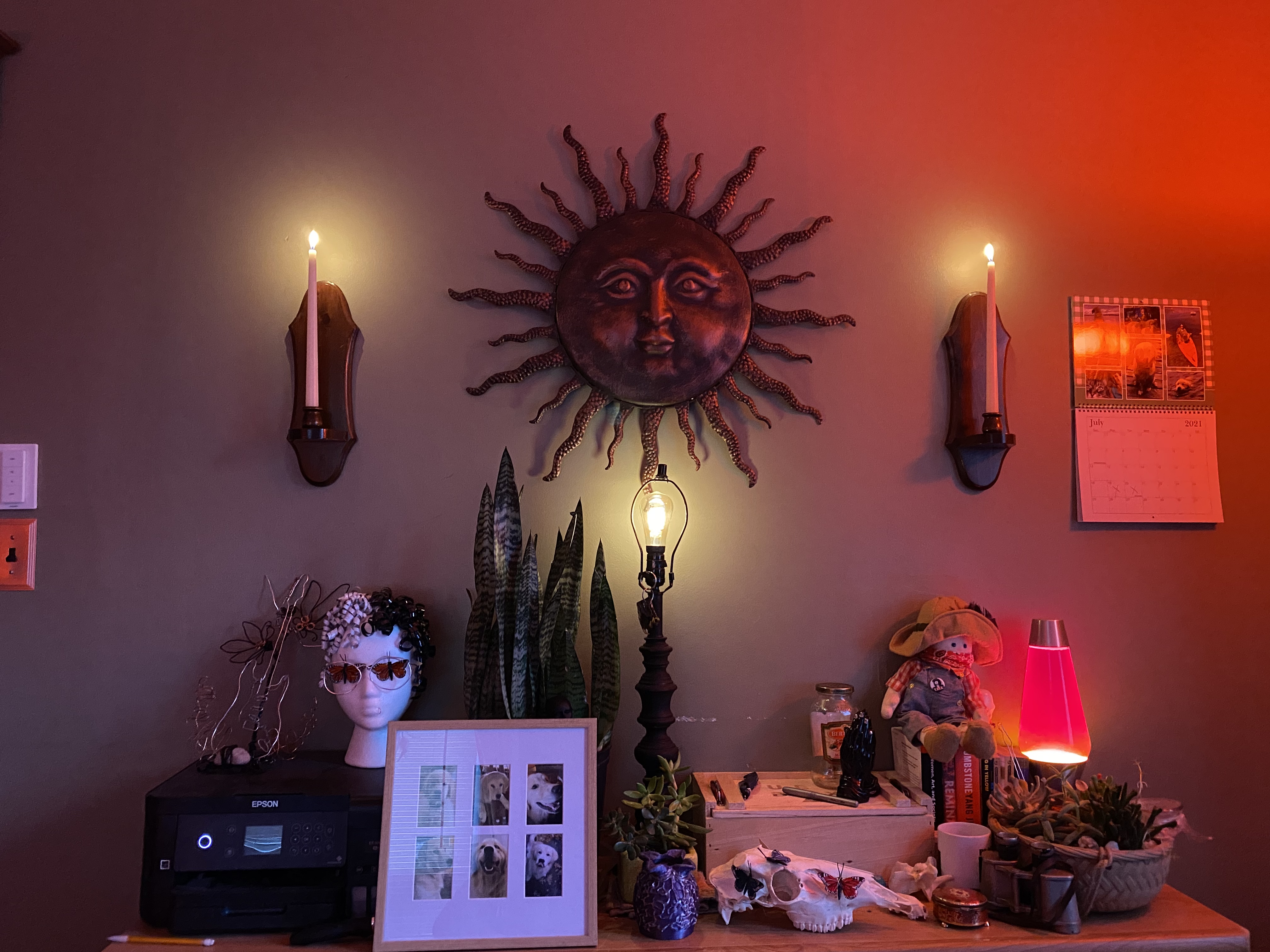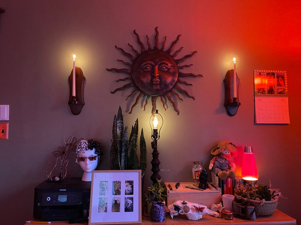 Also, I found two darkly-stained wooden candle sconces while I was at goodwill to. I’ve been accumulating weird objects and decorating my space with them for a while now, and I thought these would be amazing to create some kind of altar-looking decoration right in my room. Everything you see is thrifted, gifted or made, besides the printer and Lava Lamp. It’s my creative corner and my go-to place to salute the sun god, Ra, every morning before I brush my teeth.