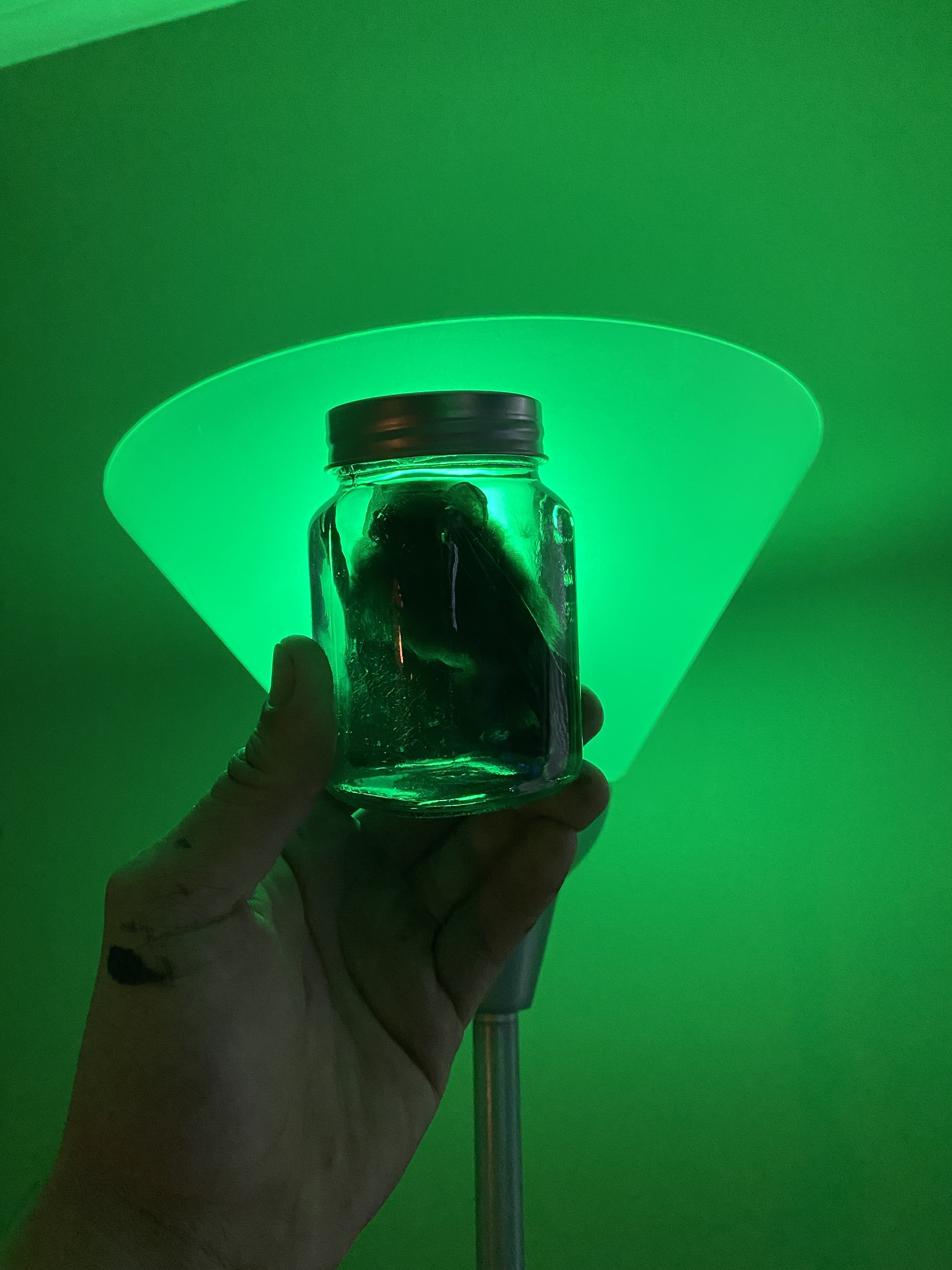 Last blog post I mentioned the dead bat I found in my attic. Well, after its body exchanged fluids with the alcohol I left it in (that’s technically what happens during embalming… I think that’s why they came up with a separate word for it) I followed up by injecting it directly with alcohol using a small syringe and I put it in a small jar filled with rubbing alcohol. Here he is, my male little brown bat, currently sitting on my desk gallery.