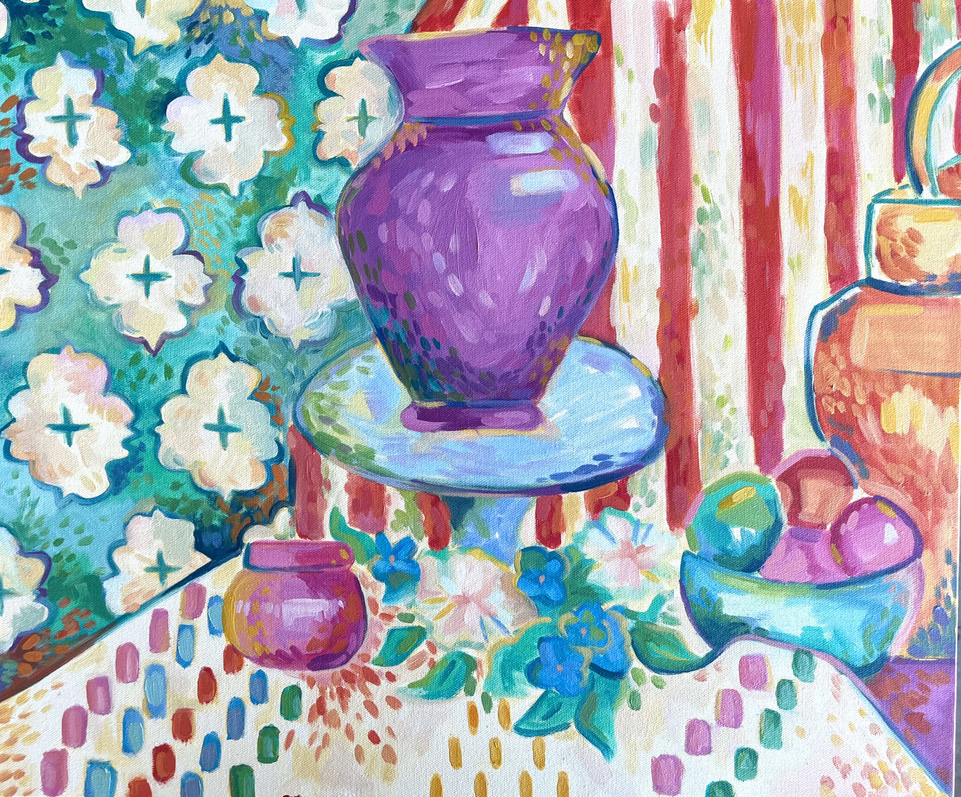 Before starting this painting, we were presented a wide arrangement of Henri Matisse’s artworks. The assignment entailed that we should paint our next still life whilst attempting Matisse’s approach. What really struck me about his work was his usage of vibrant colors, movement, texture, and the flattening of planes. Still, this piece remains as a personal favorite of mine from my own body of work.
