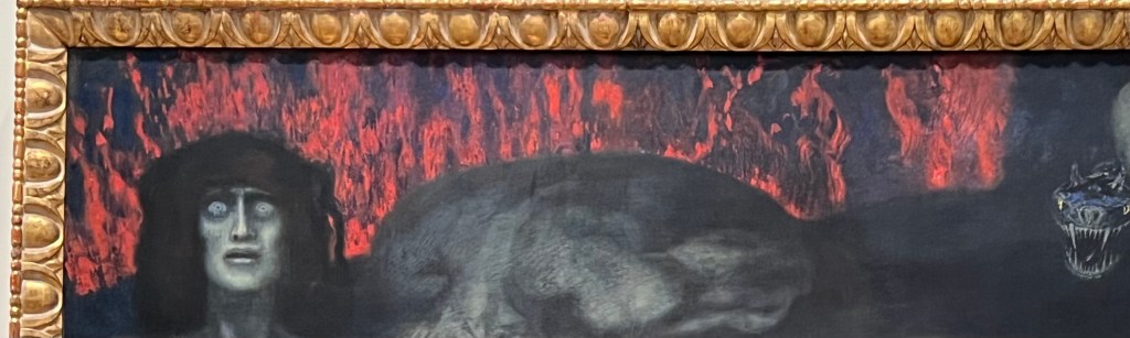This painting was by itself, possibly, not surrounded by anything that can relieve you of the unsettling visuals, maybe. In truth, I can’t say for certain if it was near other paintings. The haunting nature of it sucks you in, and suddenly, where are you? This phenomenon, this painting, is called “Inferno”, and is an oil on canvas by a German painter by the name of Franz von Stuck.