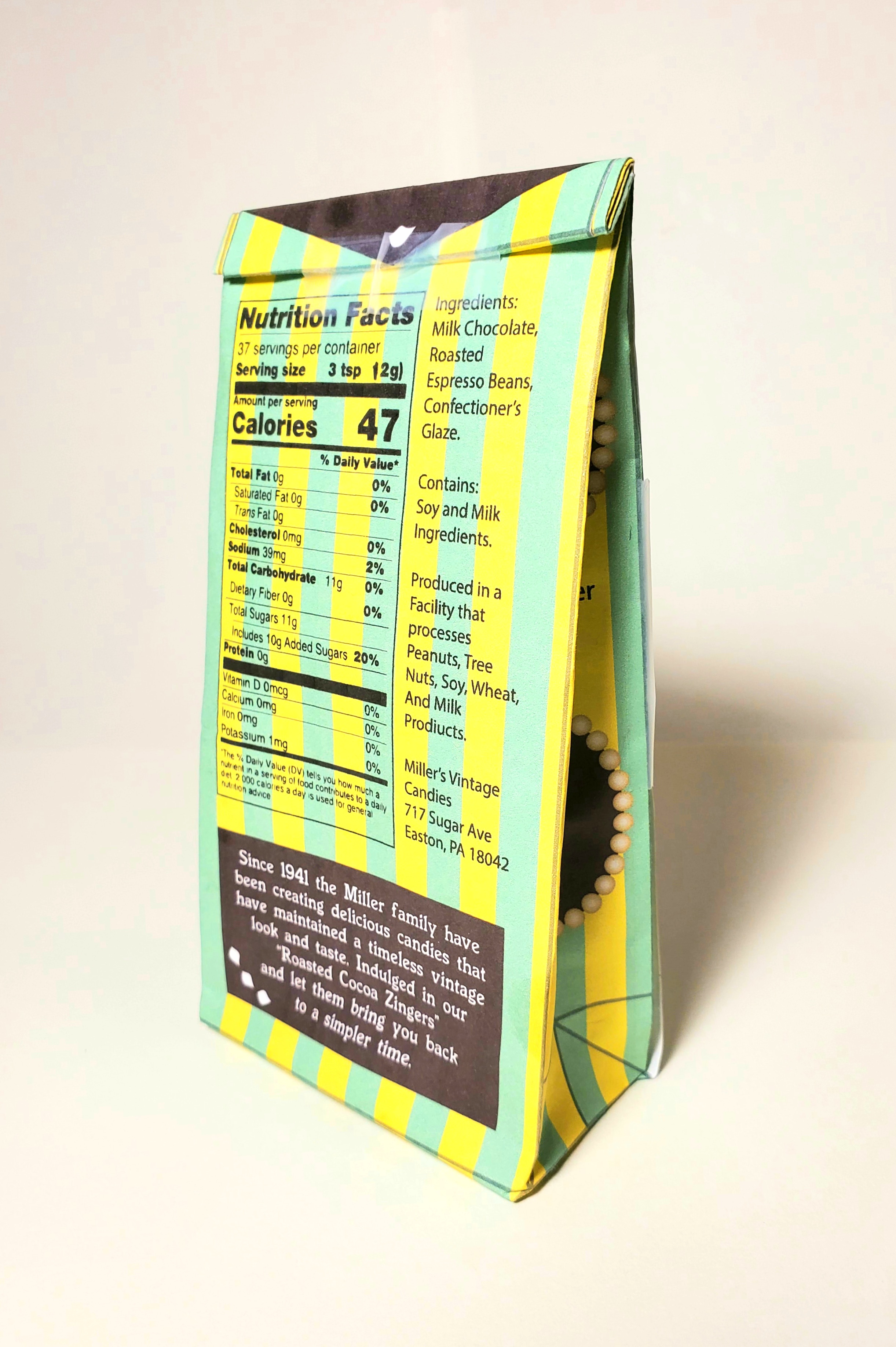 Our first project was to make a package design for candy with a focus group in mind. The focus group that we could choose from were age ranges, so for examples Baby Boomers, Generation X, Millennials, etc. I chose the Silent Generation because I wanted to make a vintage looking package design. When it came to creating the concept of the package design I was required to research my chosen generation for marketing facts to help me make a successful design that was not only pretty to look at but would attract my focus group. My research showed that the Silent Generation has more expendable income than younger generations, and that they appreciate a classic elegant style. I looked up appearances of 1940’s candies stores and adopted the striped patterns of the candy store canopy. I also found that coffee and chocolate were a fan favorite of that generation. With all my research combine I made, “Miller’s Roasted Cocoa Zingers”.