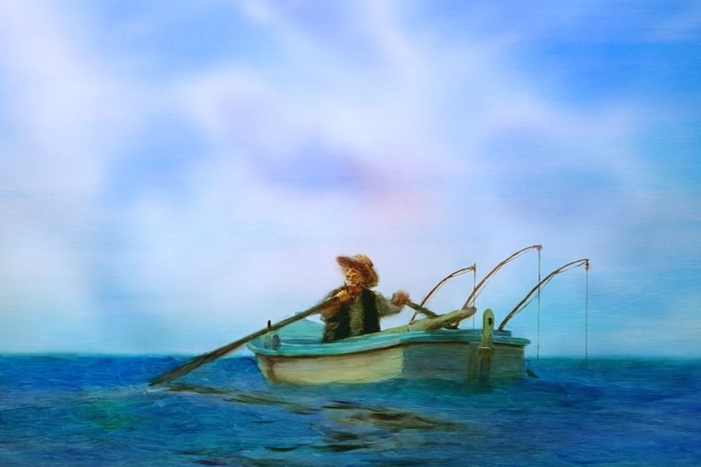 For an excellent example of the paint-on-glass animation, let’s look at Aleksandr Petrov’s 1999 short film The Old Man and the Sea. Aleksandr Petrov serves as a golden child of paint-on-glass animation— with the success of this film particularly boosting the knowledge of the technique in America; although, this film is Petrov’s fourth paint-on-glass film and fifth directorial work overall. An adaption of the Ernest Hemingway novel of the same name, The Old Man and the Sea follows our titular old man as he sails into our titular sea on one last fishing expedition, with the film animated by Petrov (assisted by his son, Dimitri) using pastel oil paints on glass. The immediate and overwhelming impression I got from this film remains how impressive and masterful Petrov’s painting and animation skills present themselves— his style of romantic-realism creates such captivating and breathtaking stills that evolve into an otherworldly and mesmerizingly beautiful piece of animation. Furthermore, despite some clunky dialogue— the implementation of the paint that expertly conveys the narrative— especially underscoring the film’s more spiritual aspects with stunning impressionism and punctuating the action scenes with an added sense of chaos and fluidity.