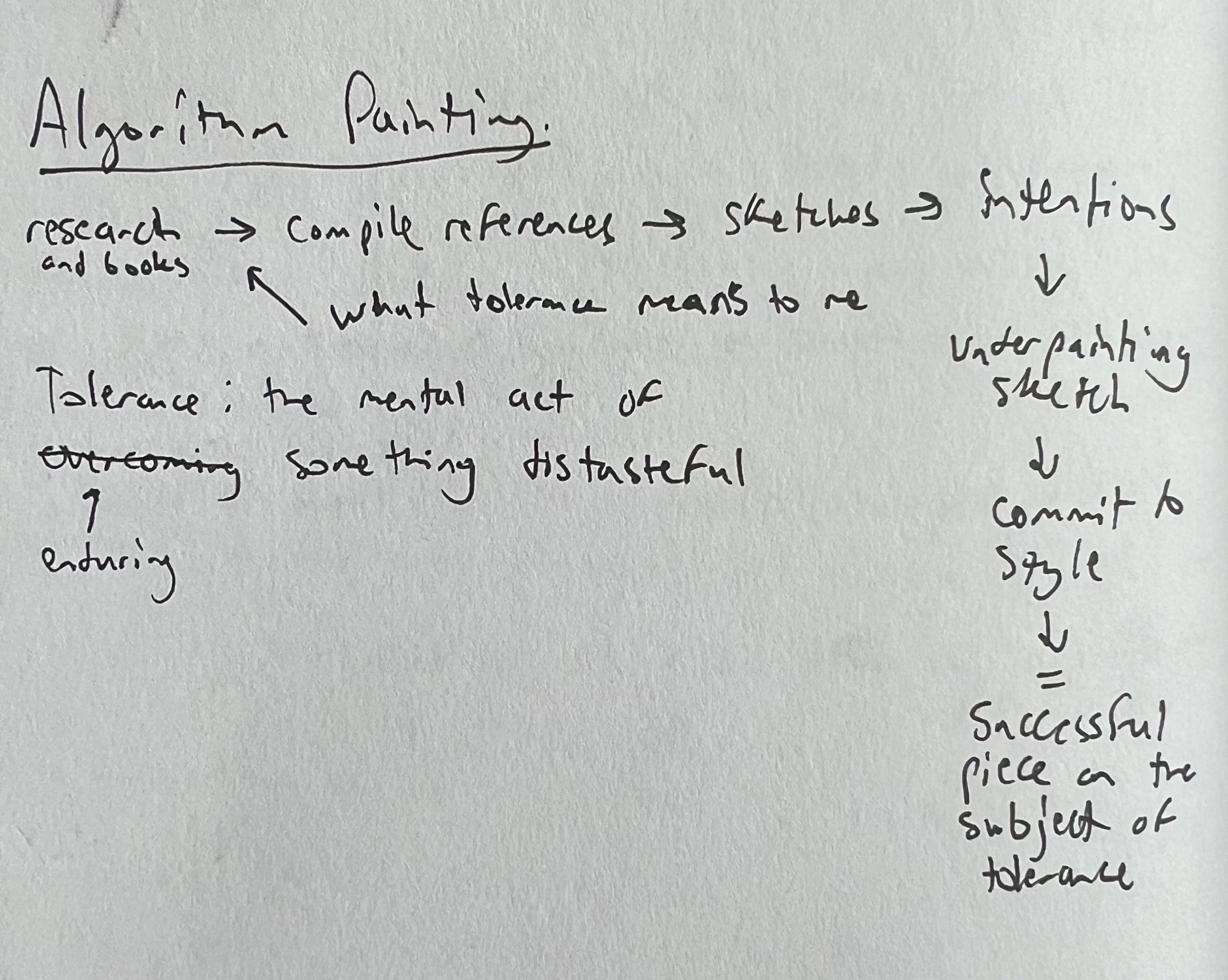 In order for the painting to be based off an algorithm, I had to first map out an equation/sequence of my workflow. So I started with research, then what tolerance means to me, compile references, make sketches, think of intentions, do an underpainting, commit to a style, and all of this would add up to a piece that fits the theme. We were given three words to choose from which were (Injustice, Tolerance, or Ignorance). Originally I planned on utilizing portraiture or the human figure, but I thought I would challenge myself by creating a still life in order to display my idea.
