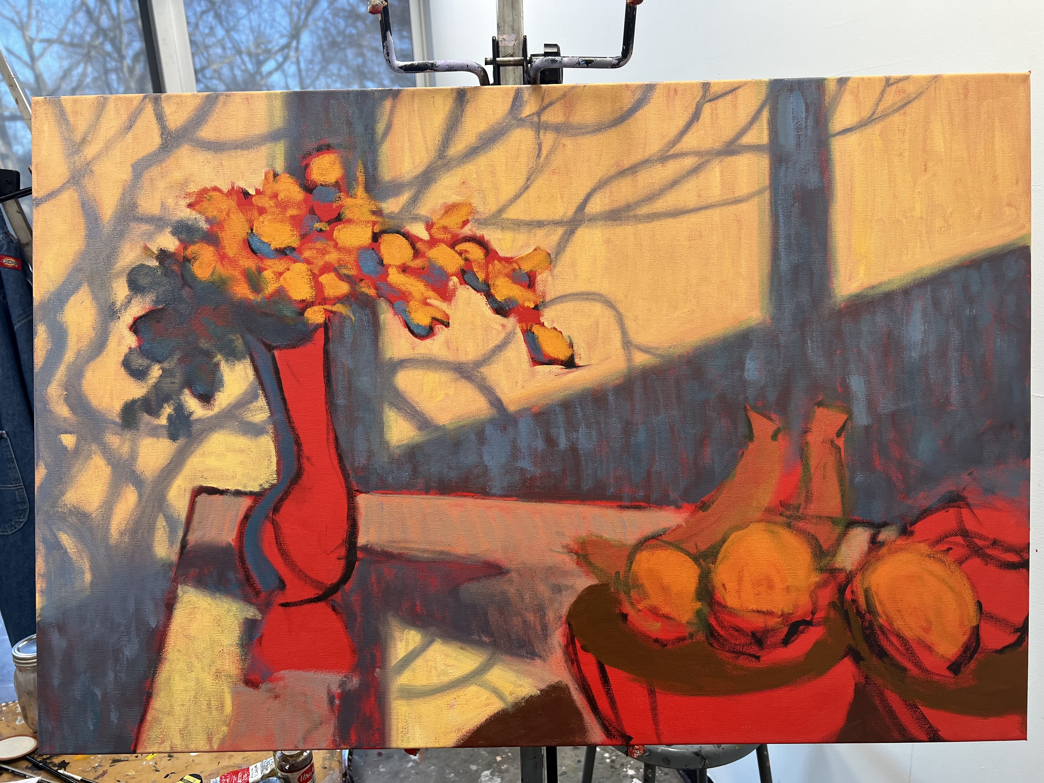 As I compiled references, I found a handful of artists that I thought would help with my piece. For the window lighting I was inspired by Mondrian’s earlier tree paintings. Overall, I was influenced by different colorful, post-impressionist still lives. I also recently helped hang the work of contemporary artist C. Martzloff. Being up close to her still lives gave me a few ideas, especially with the bright red underpainting and line work.