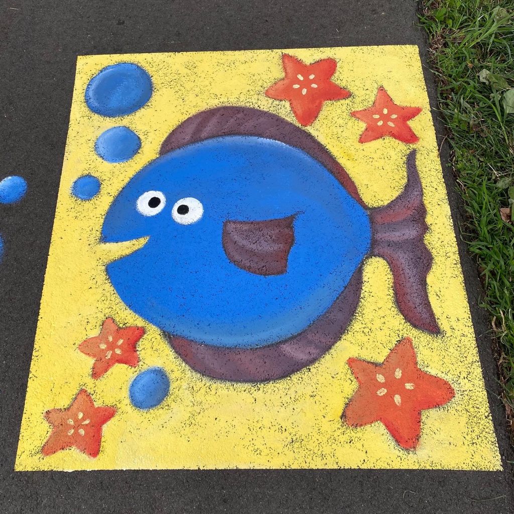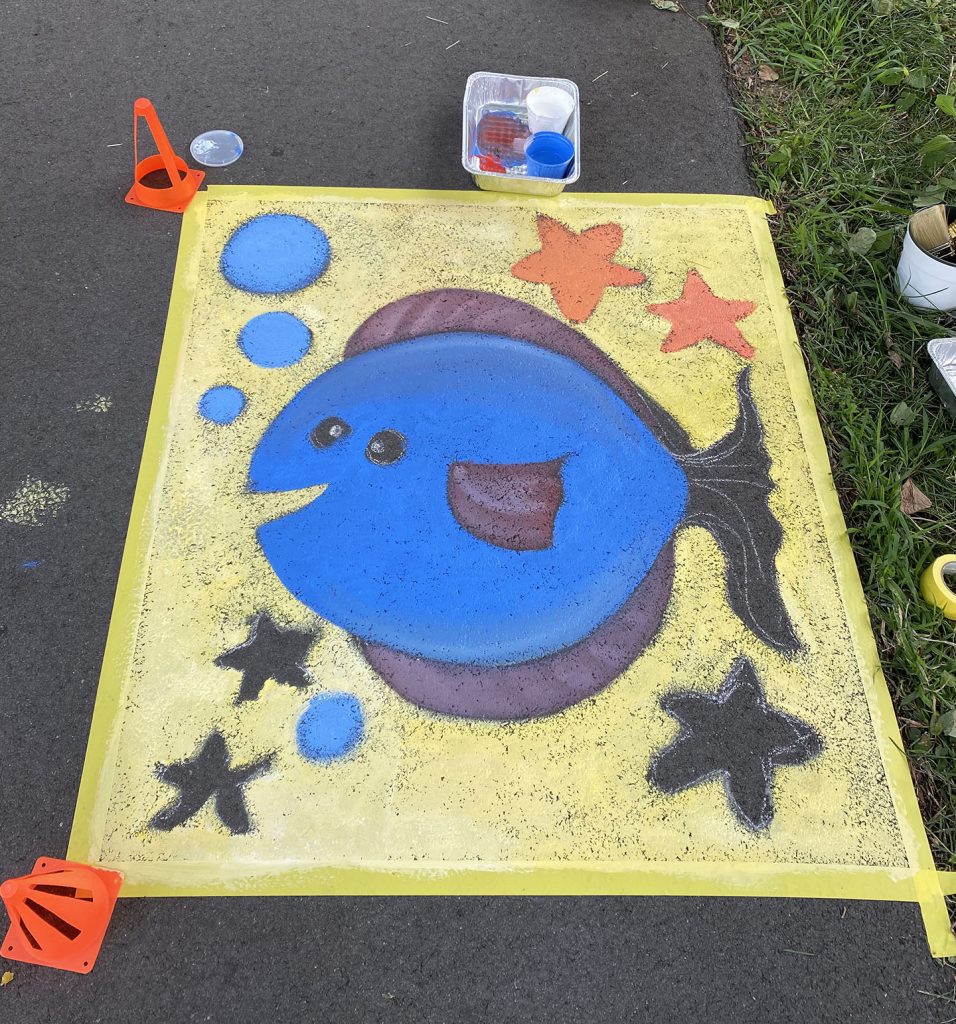 I had some helpers with me, my wonderful mom and grammie, that helped me paint in the solid area of the background. They helped me complete this project a lot quicker. I had the primary colors to work with which I mixed to make my purples and oranges. The pavement was surprisingly a nice texture to work on with the paint. The yellow paint splotch on the left side of the photo is from me stepping in the paint before it had dried, don’t worry, we added some bubbles to cover this later on! I wanted to make it look like my flounder was laying on the bottom of the ocean, so I used a yellowish tan color and starfish to make that easier to see.