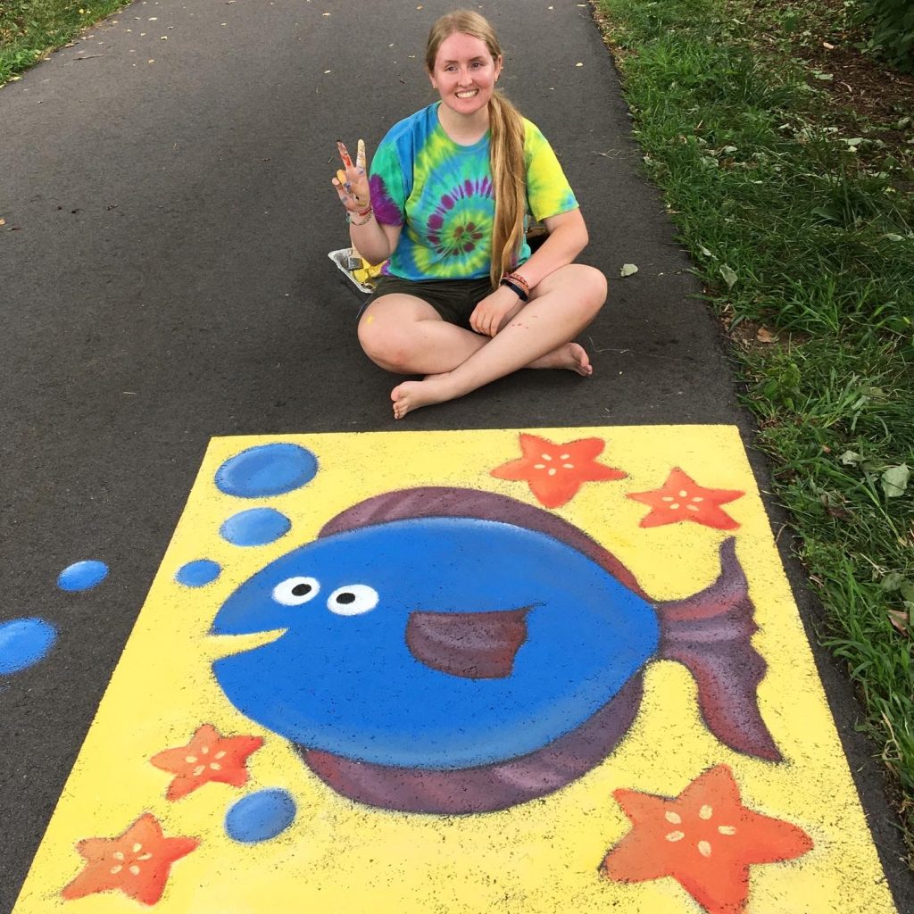 I sketched out my design before I started working on a piece of paper and then I drew that design again in chalk on the pavement. I knew that I wanted to do something cute and cheerful so I went with this happy flounder! I thought it would be funny to do something flat because of my painting surface being the ground, so of course I chose a fish that is notorious for being flat. I also added tape on the outside of my square so that I would have some nice edges on my artwork after I was finished.
