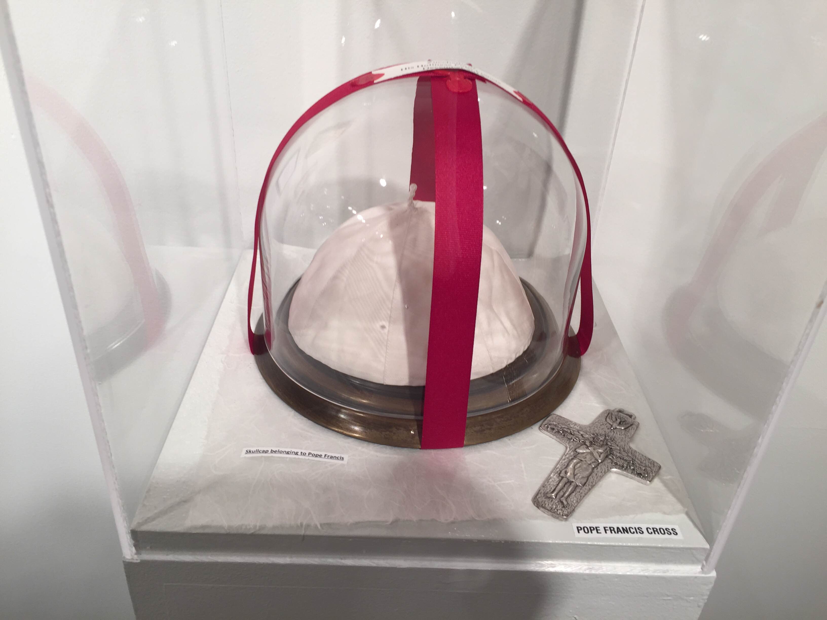 I turned around to find the little “beanie” sitting in a glass dome enveloped by red ribbon and a glass case. The tag said “Skullcap belonging to Pope Francis” and I couldn’t believe my eyes.