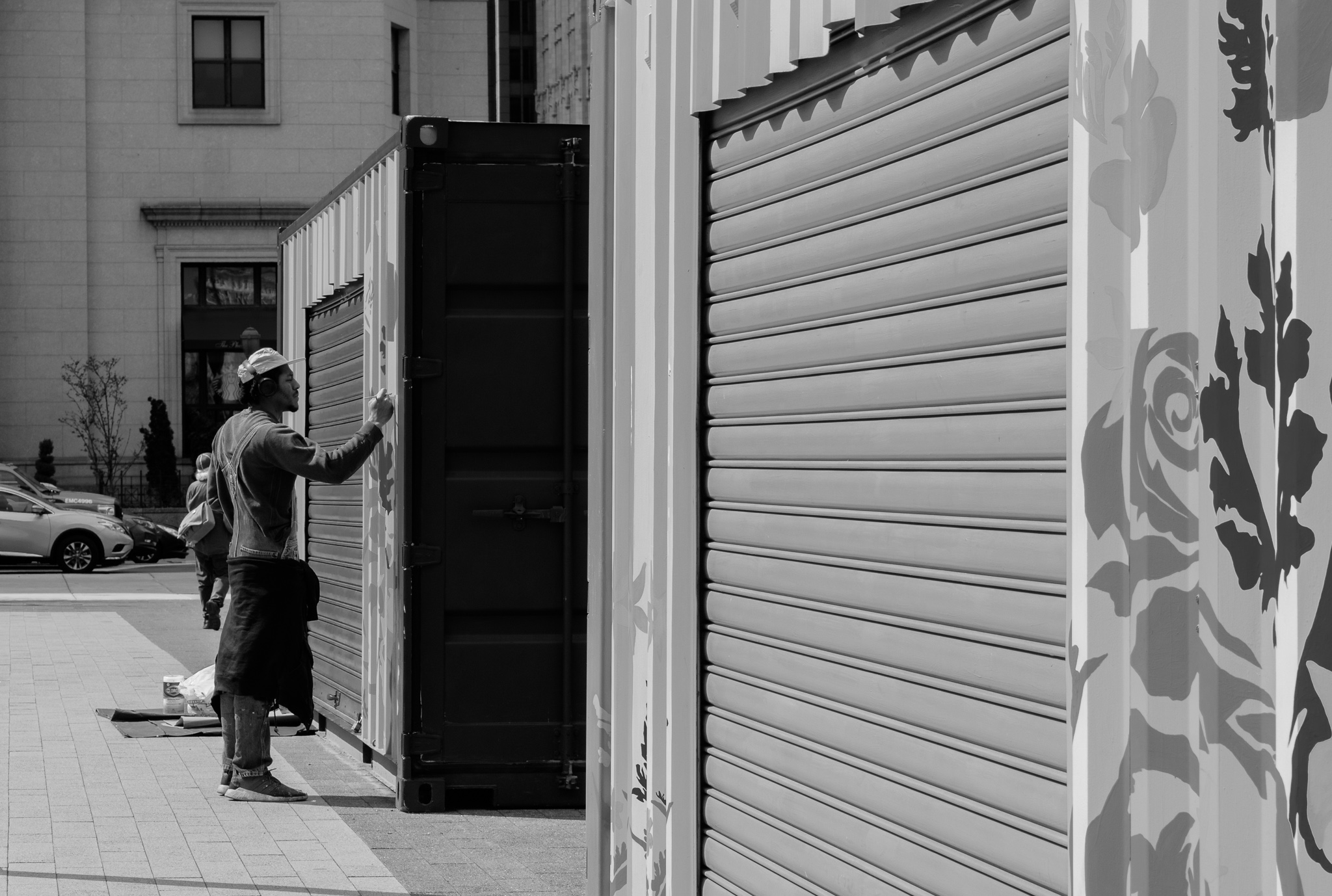 Image Six: Me and my friends were walking around the Reading Terminal Market, finding something to eat for lunch. When walking I passed this sign that said, ” Don’t Make me Release the Flying Monkeys ” I found this very funny. So i had to take a picture of it! But the more I looked at the image I saw potential. Because when you look at it, you can see the surroundings and all the materials used to make the food being served, and I was able to perfectly get the one worker washing her hands in the frame. Image Seven: When walking back to the museum, we passed a man going to the Reading Terminal Market, and I didn’t take a picture of him because I didn’t see potential. But on the way back I saw a different perspective of him! I was able to get close and compose my image. I have this same image in color but seeing in black and white it made it interesting, because I feel this makes a perfect captured moment in time image, A man painting what to be sheds. And when looking a this image you see leading lines and a-lot of geometric shapes! Image Eight: As for this is the last image, this was another image that I truly didn’t think of taking a picture of. But again my instinct told me to take the picture anyway! As we we were waiting for the light to turn green for us to walk. I thought it would be interesting to capture these people also waiting to walk across. The surroundings of the cross walk leading towards them, the signs and the trees make it a unique image especially in black and white!