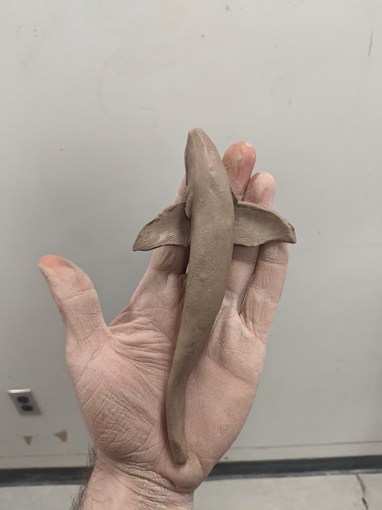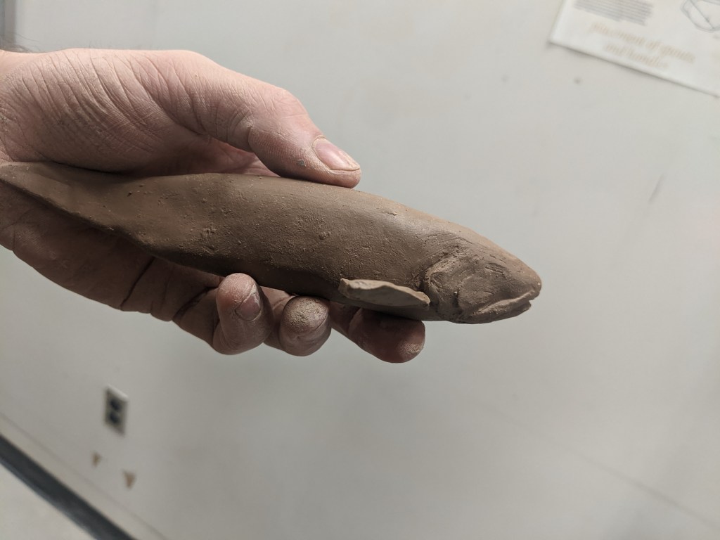 Here is the initial stages of the brown trout sculpture I was working on this week. at first the details dont matter because it’s about getting down the shape and profile of your subject. You can see the suggestive shapes here and the beginnings of gills and facial structure going on.