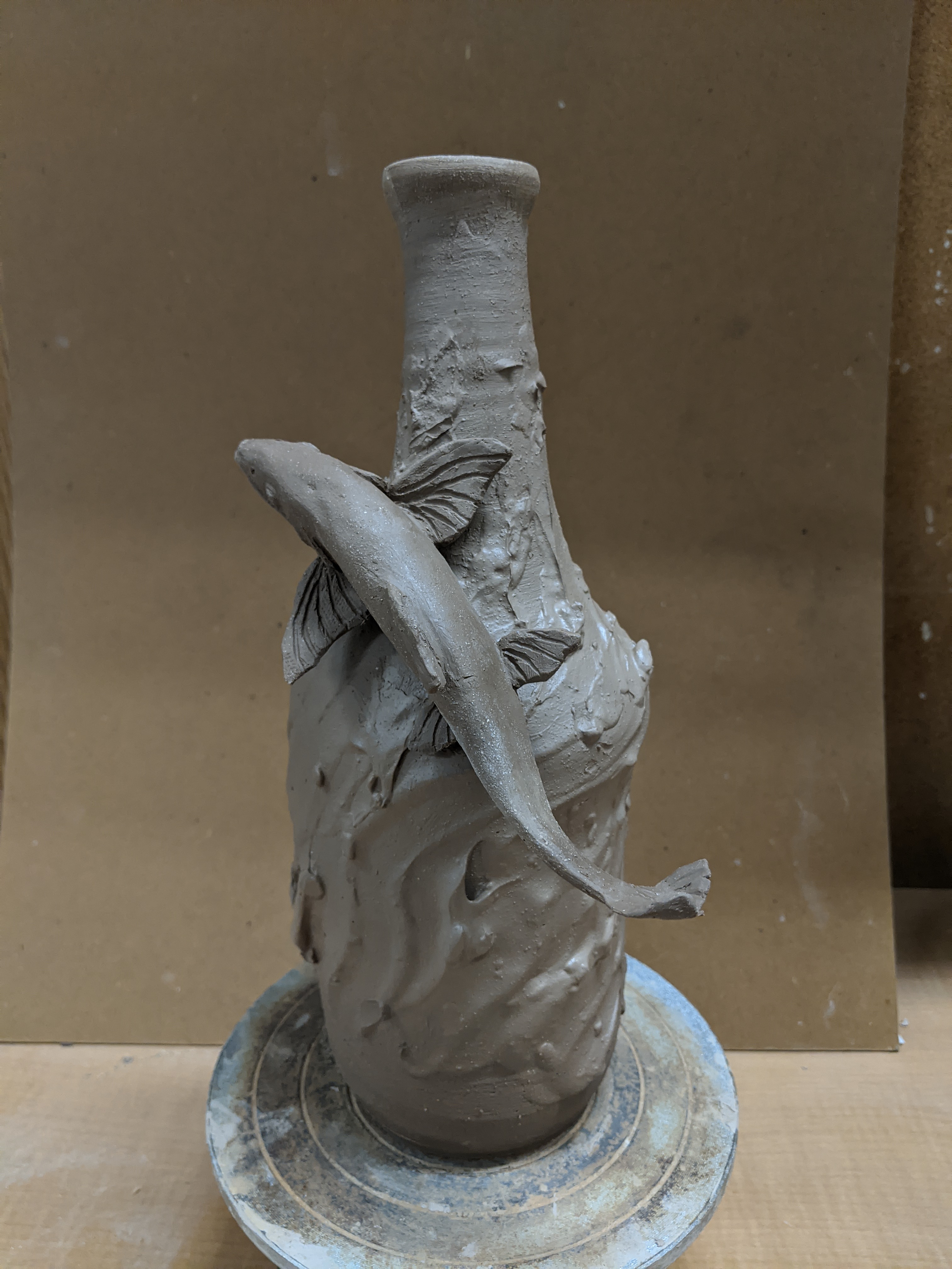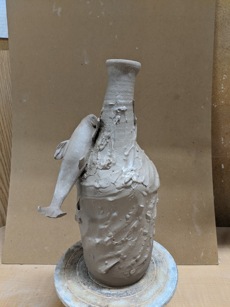 Finally seeing the sculpture being put together with the bottle was nice. I altered the bottle from its original thrown form to give it a much more organic flow, and then put a slip design on to mimic a watery surface. The glazing comes next and could make or brake this depending how it comes out.