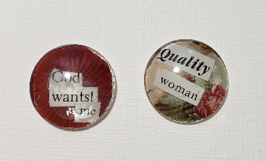 It is only one to three words (depending on font size), that are placed on the bottom of clear crystals. Then, sealed with Mod Podge. You can also use smaller images or patterns for a background. They can take about to 15-30 minutes to make, and are about the size of a nickel!