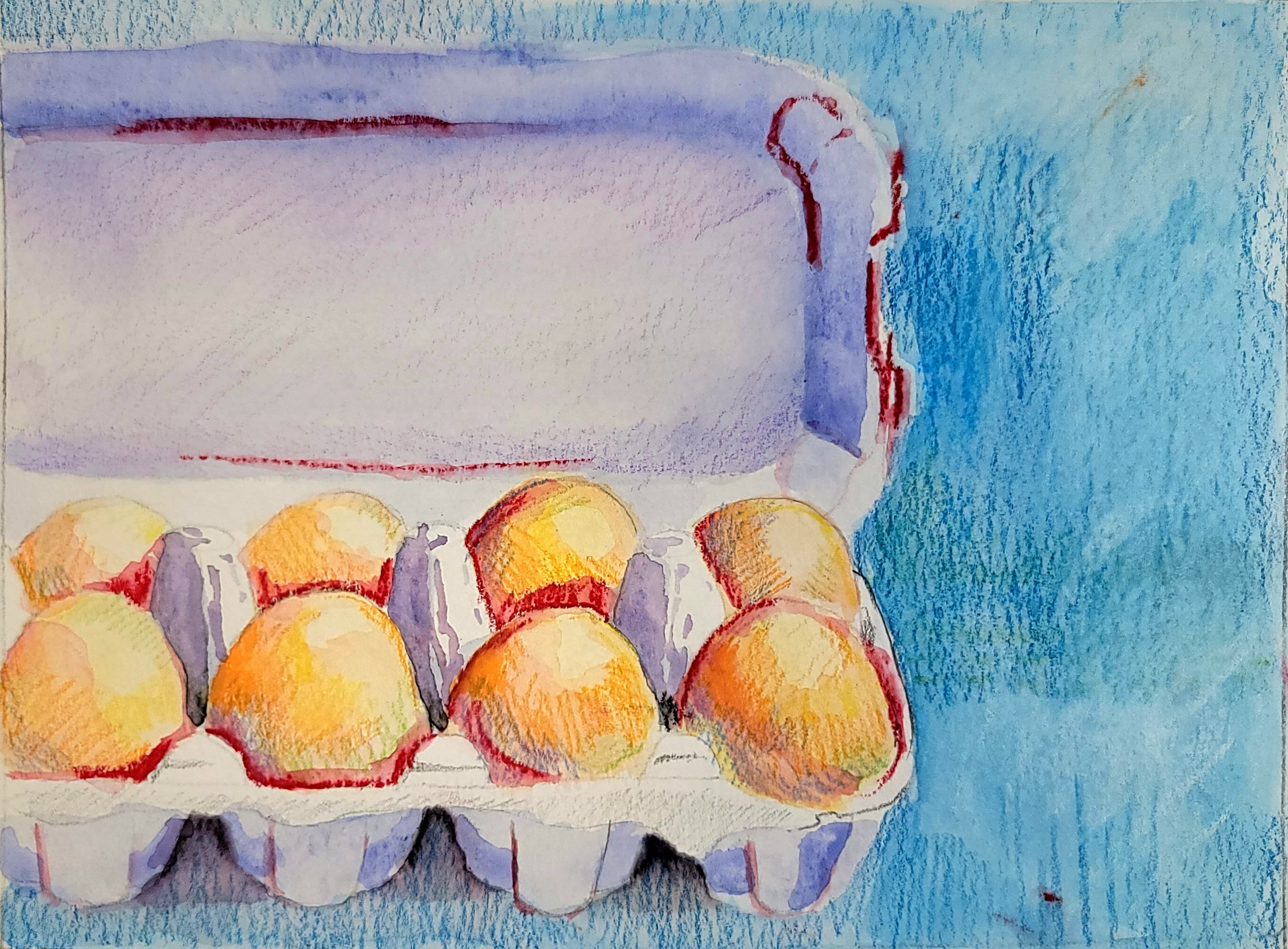 I’ve chosen a mixed media approach that includes paper collage, paint, and various drawing mediums. The open egg carton displays bright colors and textures relevant to the Pop Art movement, along with the familiarity of the object. The orange and blue create a high contrast that plays with the eye, and the red outlines that allow the image to pop out are reminiscent of Wayne Thiebaud’s work.