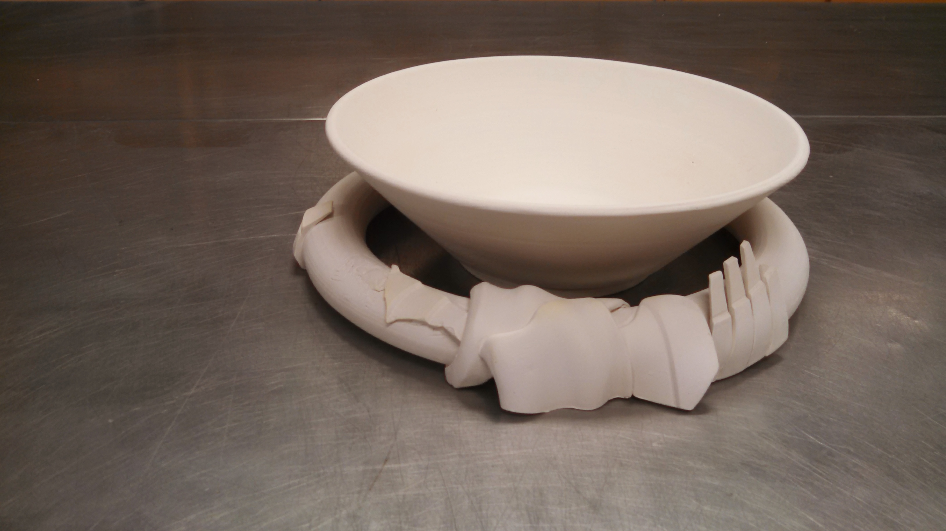 The above photo shows the piece bisqued and not glaze fired. I had every intention to make this a functional vessel, so naturally the next step would be to glaze the piece. However, through more discussion, the idea arose to maintain this piece as a sculptural one as is. No color. No clear glaze. No shine. I do really enjoy the uniformity that arises as a result of clean, plain white. There are some really interesting shadows that are created as a result of the slabs that protrude over the negative space between the bowl and the ring. I think it helps connect the two separate pieces. Still, I was uncomfortable with keeping it in the bisque state, so I decided to high fire the piece with no glaze. A few of my attachments had after all broken off of it, and there were a lot of different ideas that arose from making this piece that I wanted to try again. So as a test, I decided to give it a shot. It hasn’t been removed from the kiln yet, but I’ll be sure to update you about it and some other projects from earlier this semester in a post in the near future!