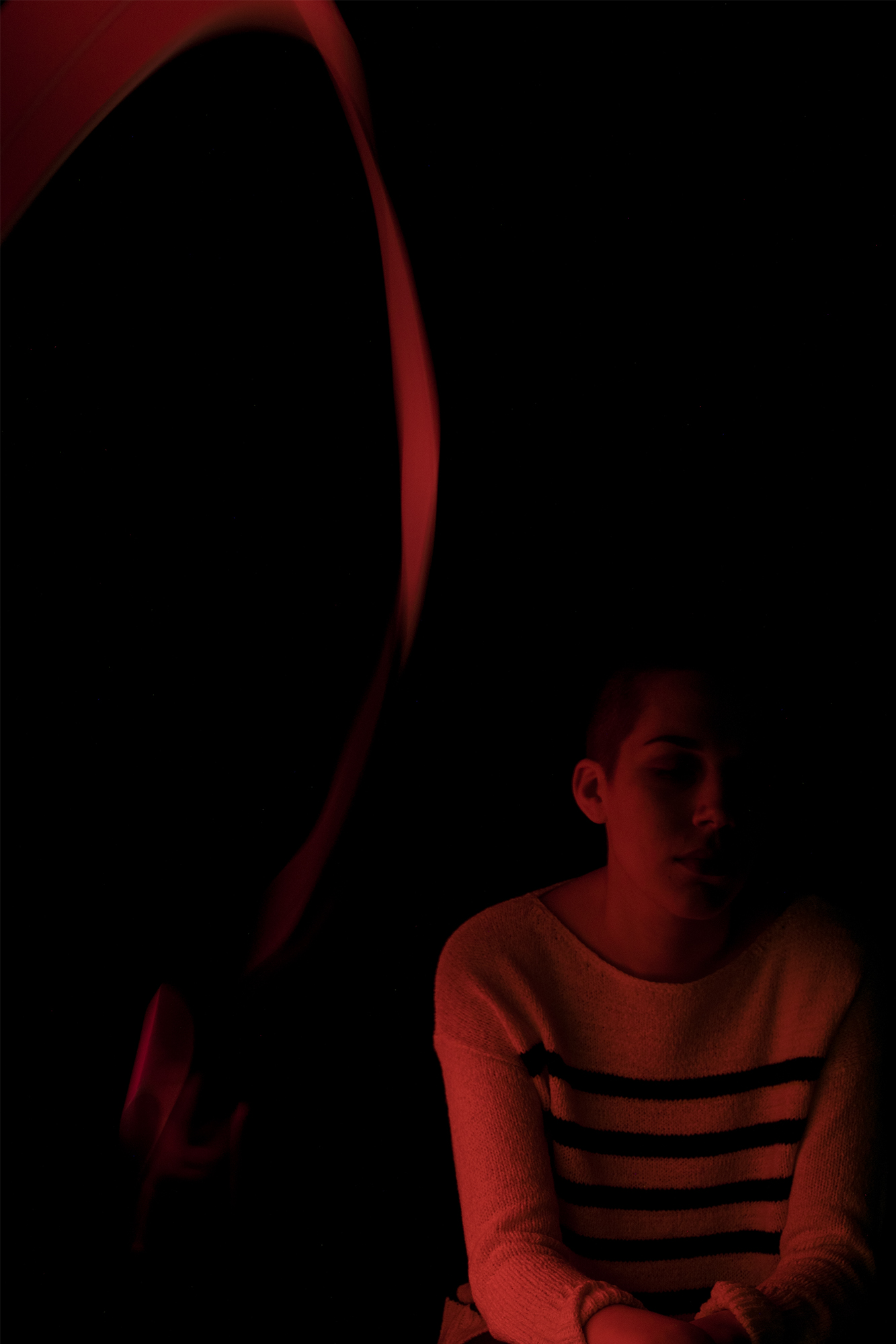 One of the more or less directly characteristic qualities of painting with light is its somewhat haphazard nature, you can totally get familiar enough with it for there to be an element of predictability in your work, but there is also still a fairly prominent “luck-of-the-draw” element in play. This proved to be the case especially one a human subject is utilized rather than a pair of sunglasses (with 15 second exposures I’m pretty much shocked that everything isn’t blurry). In general the approach I was trying to take could be summed up as trying to splash color on Mel with a softbox app on my phone, while trying to fill in the seamless paper in the background, after a little while it turned more-so into just general experimentation. That was the case especially with images such as the one with the multicolored ribbon of light in the background, which was formed after I discovered the color of the softbox changed if you shook the phone around. Perhaps the most compelling thing about this technique is its potential to replace more dedicated studio lights in certain situations.