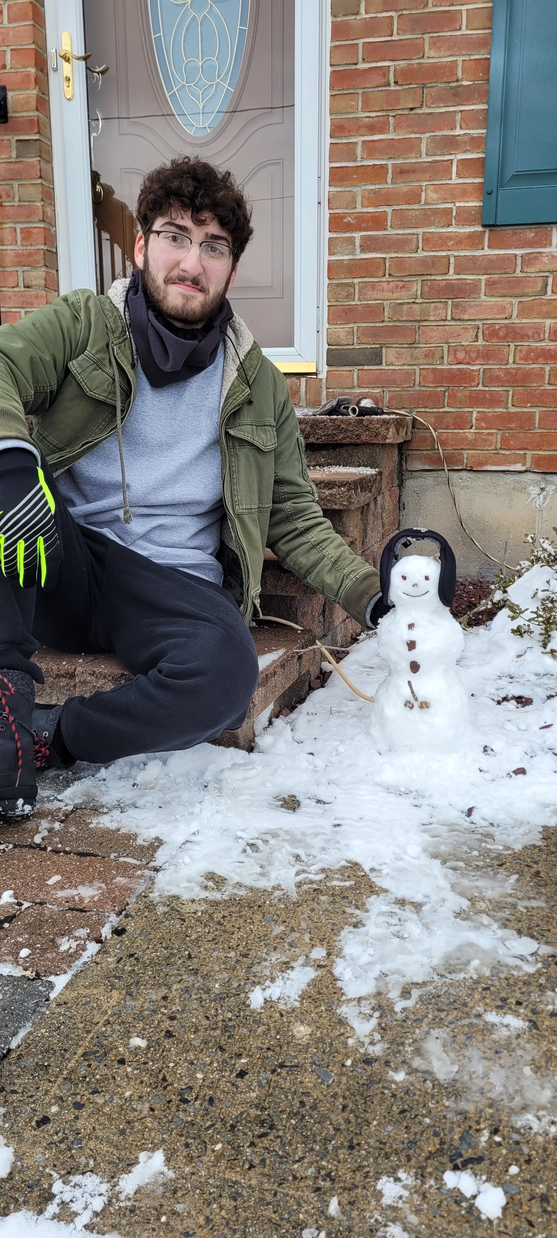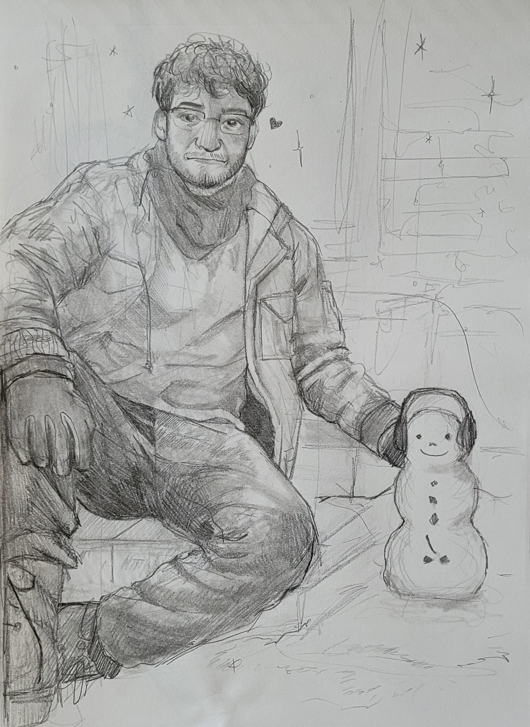 To move away from that, I wanted to draw my partner again during one of our snowy adventures. I think he is absolutely adorable!!! This day we made a snowman; he ended up melting pretty quickly due to the rising temperatures, but he was so cute.