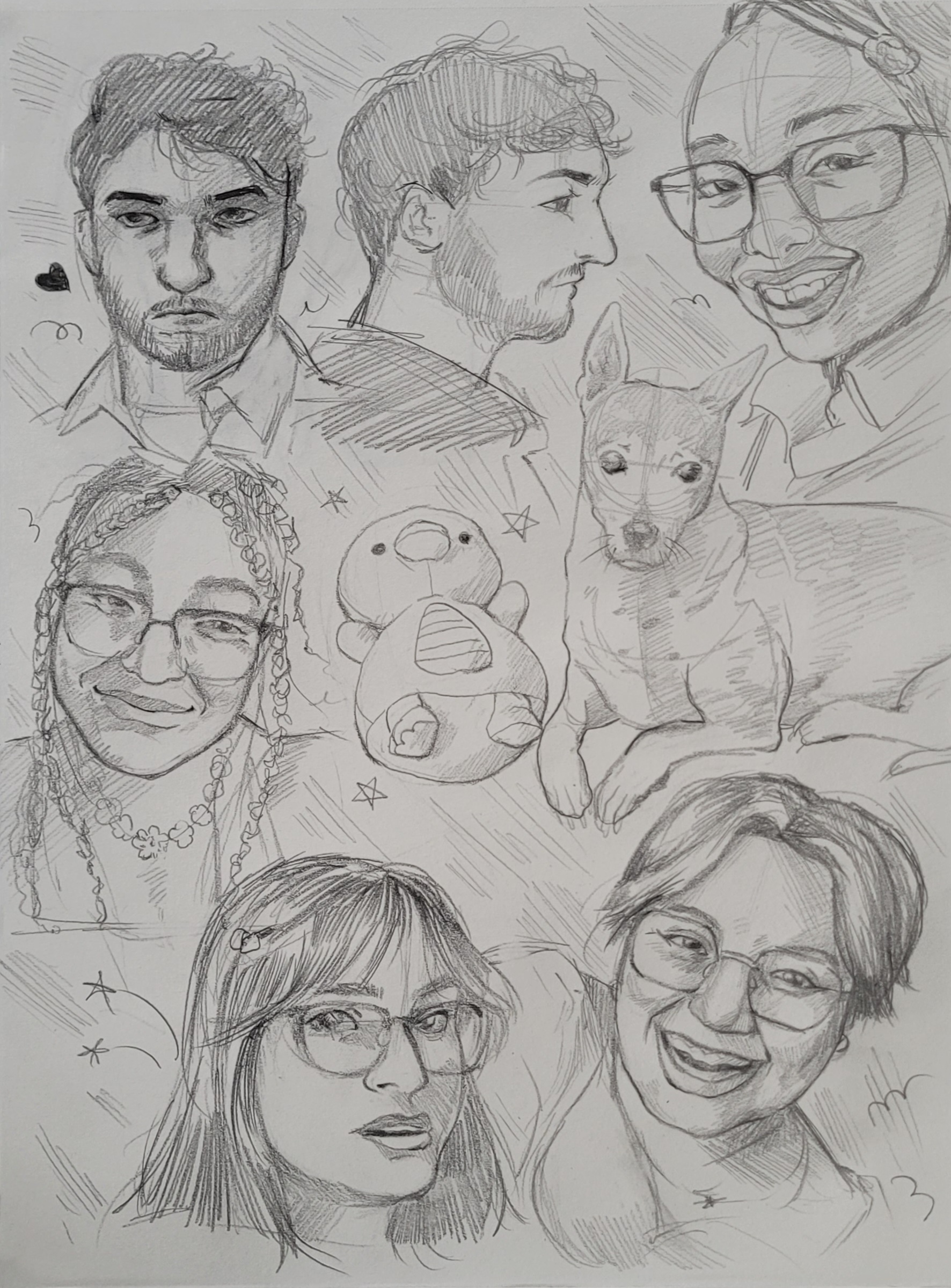 Looking for inspiration, I first began by drawing my partner. I’ve found that the best way to approach portraits is by first focusing on the general measurements, then returning to address the details. Unfortunately, I didn’t have a side view of him, so that one was done from memory. But after that, I decided to draw my friends and my pet. I found these to be decently easy since I’ve known these people for so many years. I’ve studied their faces for ages.