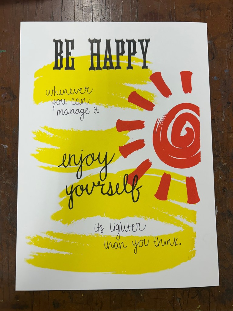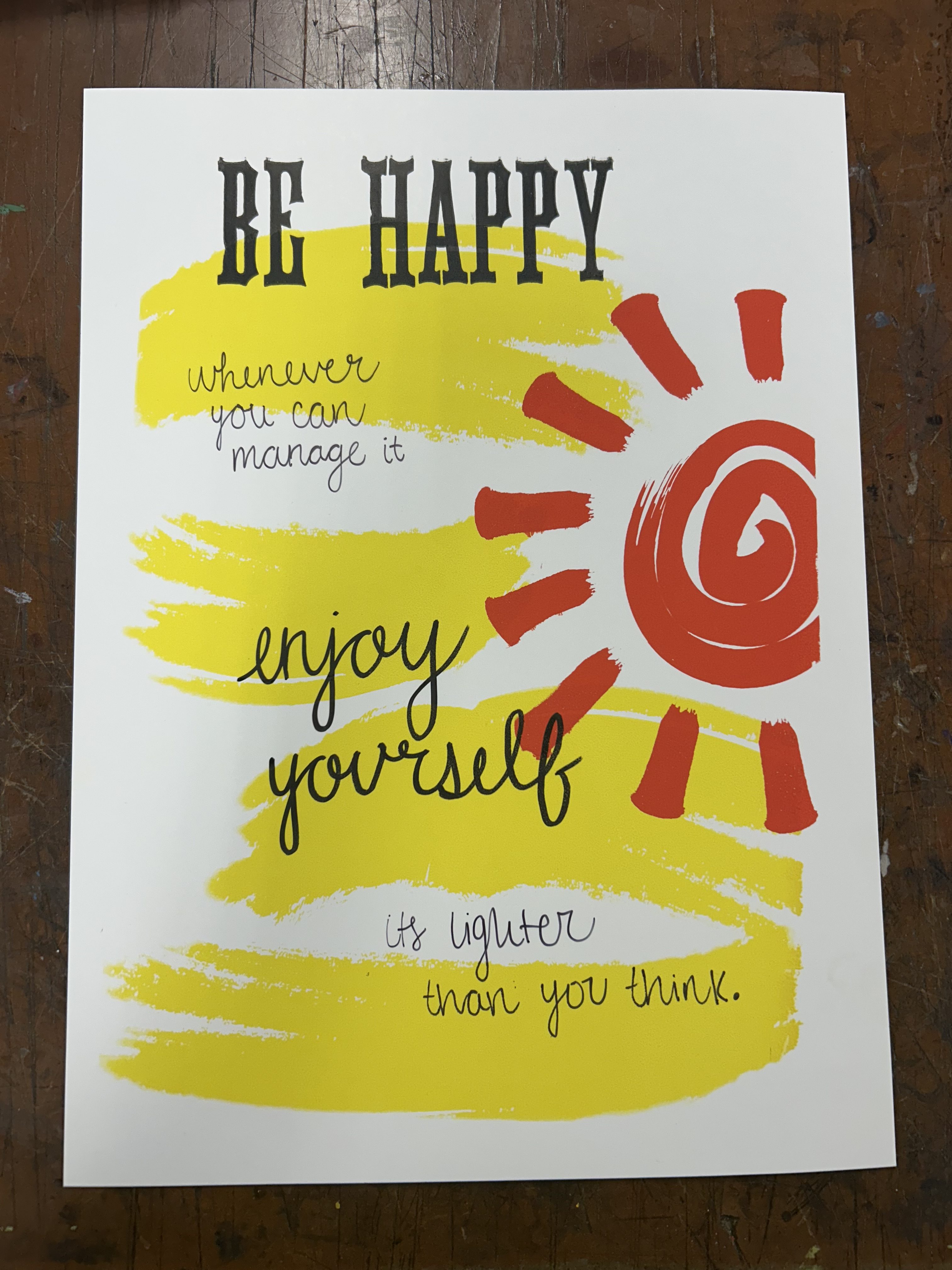 As for the process, I needed several layers for this poster and ended up doing 4 different layers. First I started with the background by creating those big brush-like strokes on a page in Illustrator and printing them out black on transparency paper so I could use photo emulsion to get that onto my screen. I started with that on the paper and printed it a vibrant yellow color. I found that Kent used lots of organic shapes and rough brushstrokes like these. I also did photo emulsion with the big sun figure as well, and that was the second step to print that on top of my yellow background. Kent tended to use a lot of bright colors, which is why I wanted to use colors like yellow and orange, also because I thought they went well with the message of being happy. Then I used a different technique for the “be happy” letters on top, I used old wood block type and used the letterpress to print that onto my poster. That is another one of my favorite ways of printmaking, it’s not what we focus on in this class but we were allowed to use any technique we wanted to. Lastly, I hand wrote the rest of the quote onto the poster, because I noticed when researching Kent’s work that she also incorporates a lot of hand writing into her works. I thought it gave it a more personal feel and I really enjoy how this came out. Learning about Kent was really inspirational and her work is really unique, so being able to create something inspired by her was a lot of fun, and my classmates made such cool posters as well!
