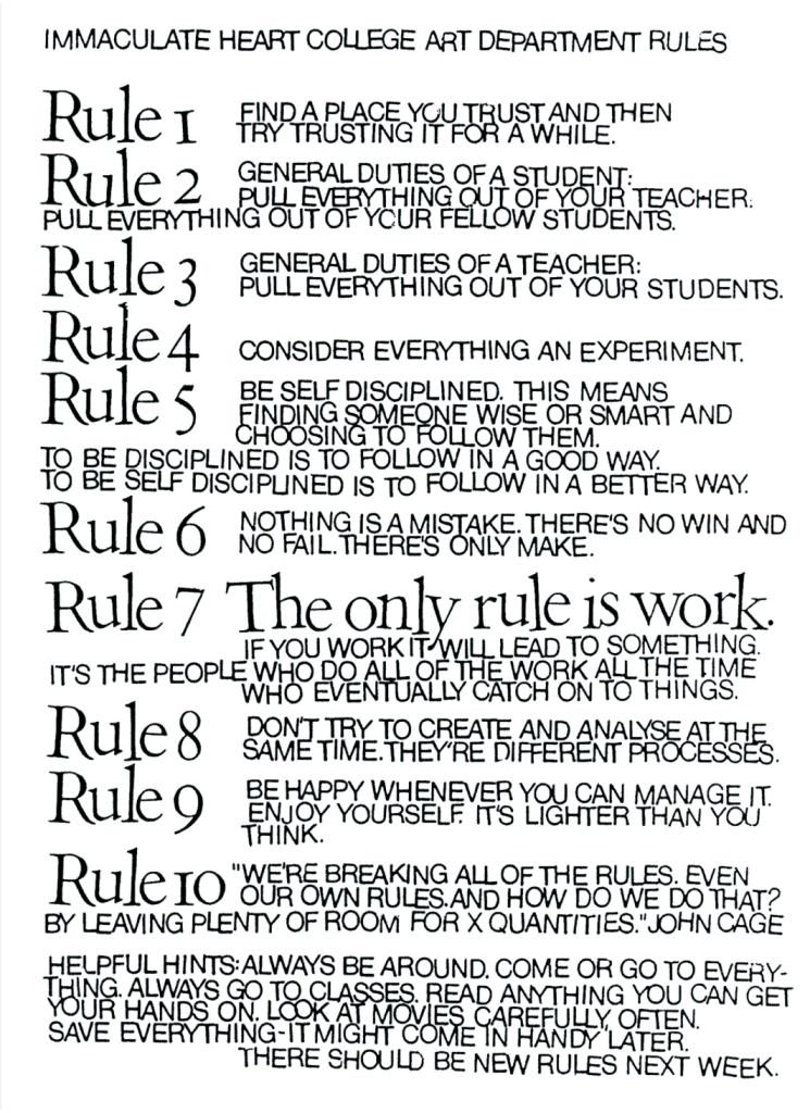 Each of us were tasked to create a poster that reflected her artistic style, which ranged from abstract expressionist to pop art as the decades went on. In that poster would contain one rule from her list of 10 rules, a set of guidelines for students and artists that she created to encourage creativity, experimentation, and self-discipline. We basically had any creative freedom we wanted, could arrange the text in any way shape or form, and many of us chose to stick with the bright colors that she constantly used in her work.