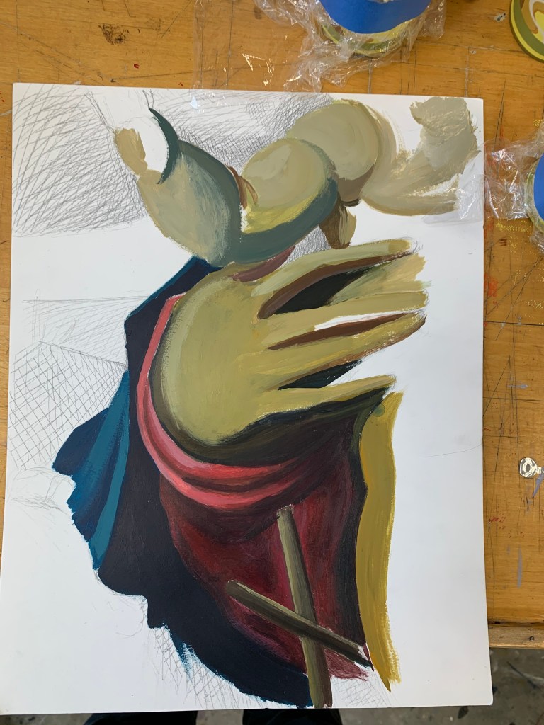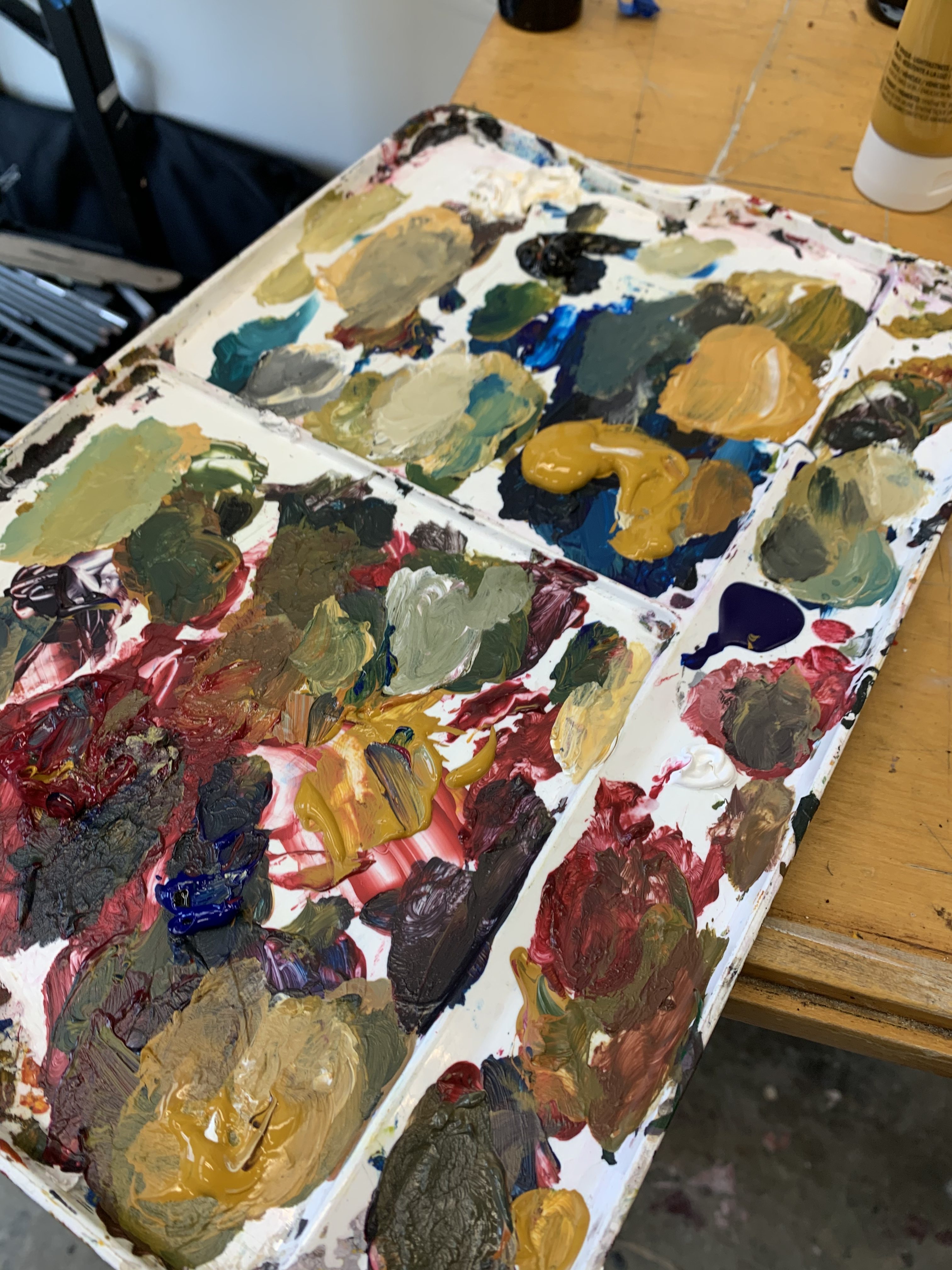 I have made some progress on this project, slowly but surely (partly because I’ve been locked out of my studio and unable to paint on about 3 separate occasions already!) However, I am not too proud to admit that I have had some difficulty painting this way. I have never pre-mixed an entire pallet before, I’m sure I’m like most and just adjust the colors as I go but i am very interested to see where this new process leads me. By pre-mixing a palette, it forces you as a painter to really see color. I know that sounds like a silly thing to learn this late in the program, the idea of actually “seeing” color but I was actually surprised how great of a reminder that actually is and a useful thing for all of us to remember!